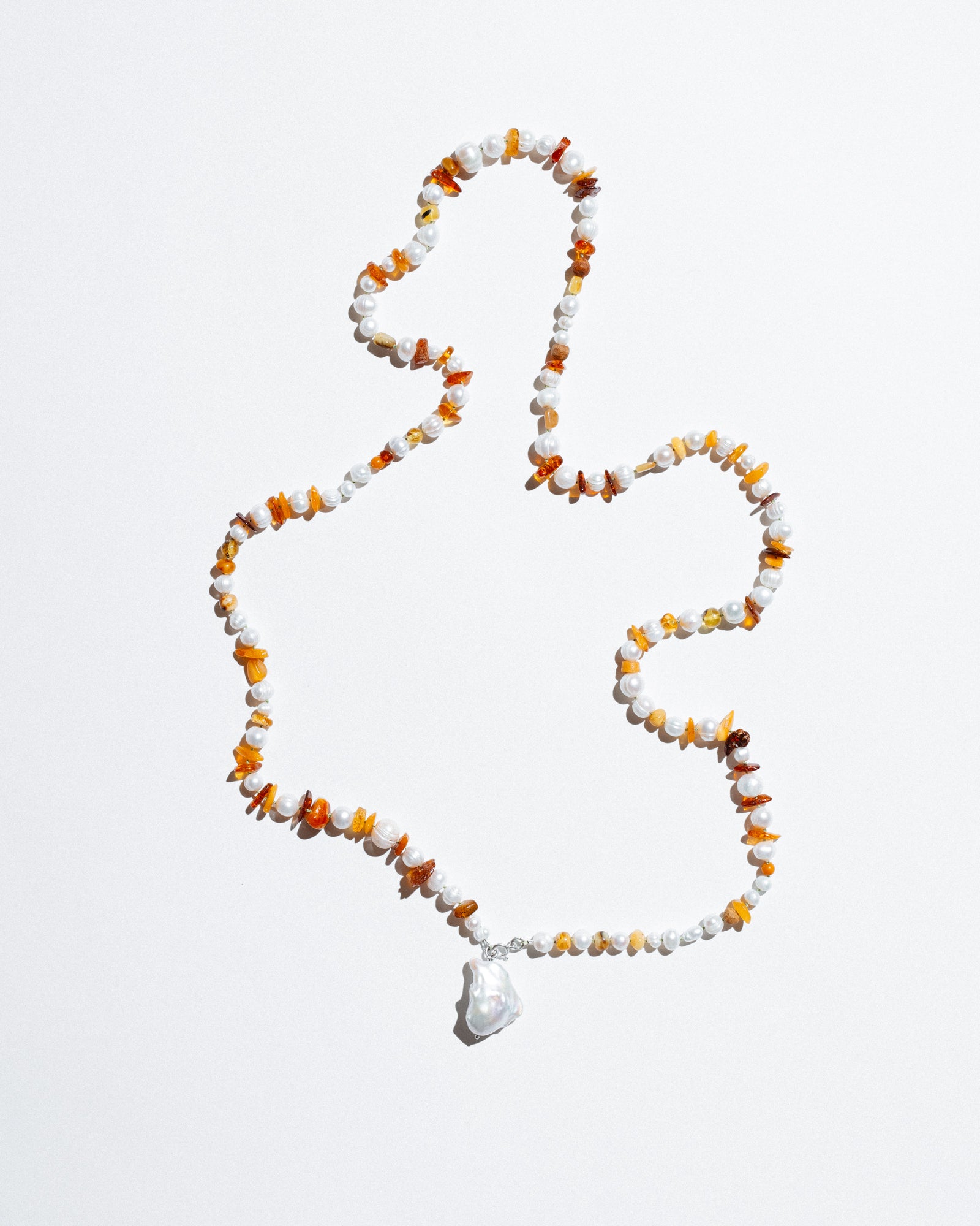 A long pearl and amber necklace will always remind you of summer and make everyday life a little sunnier. It can be fastened at different heights: worn long or as a tie. Or wrapped around your neck several times.