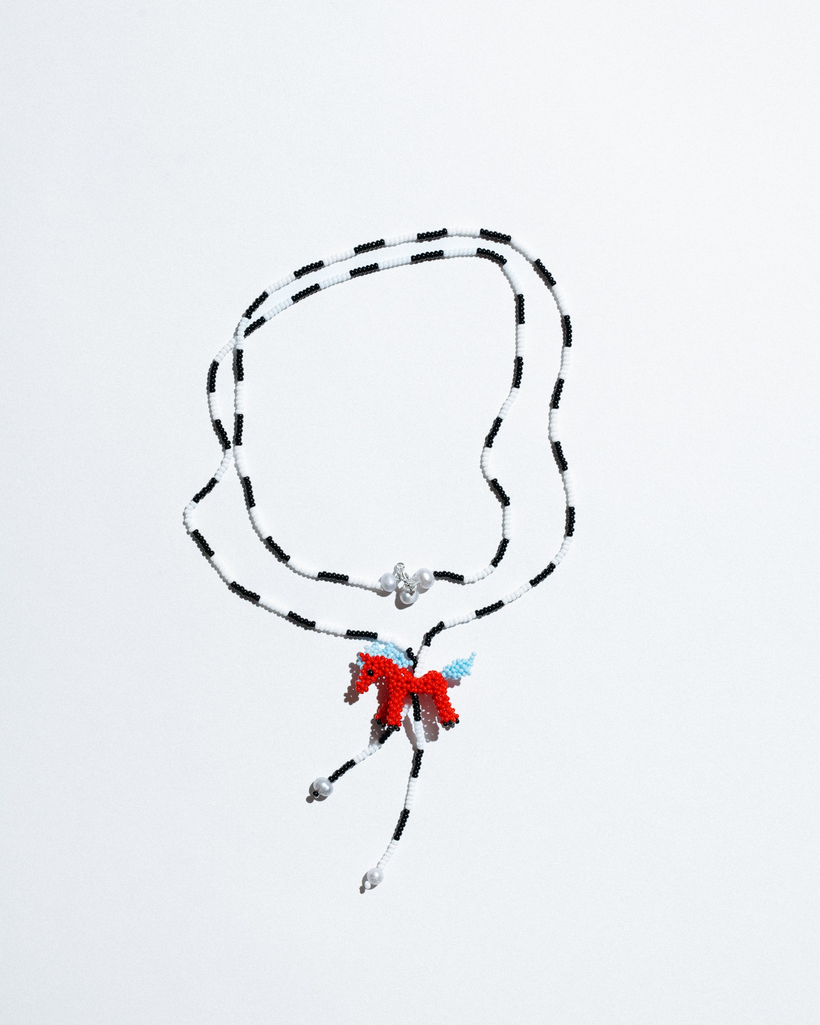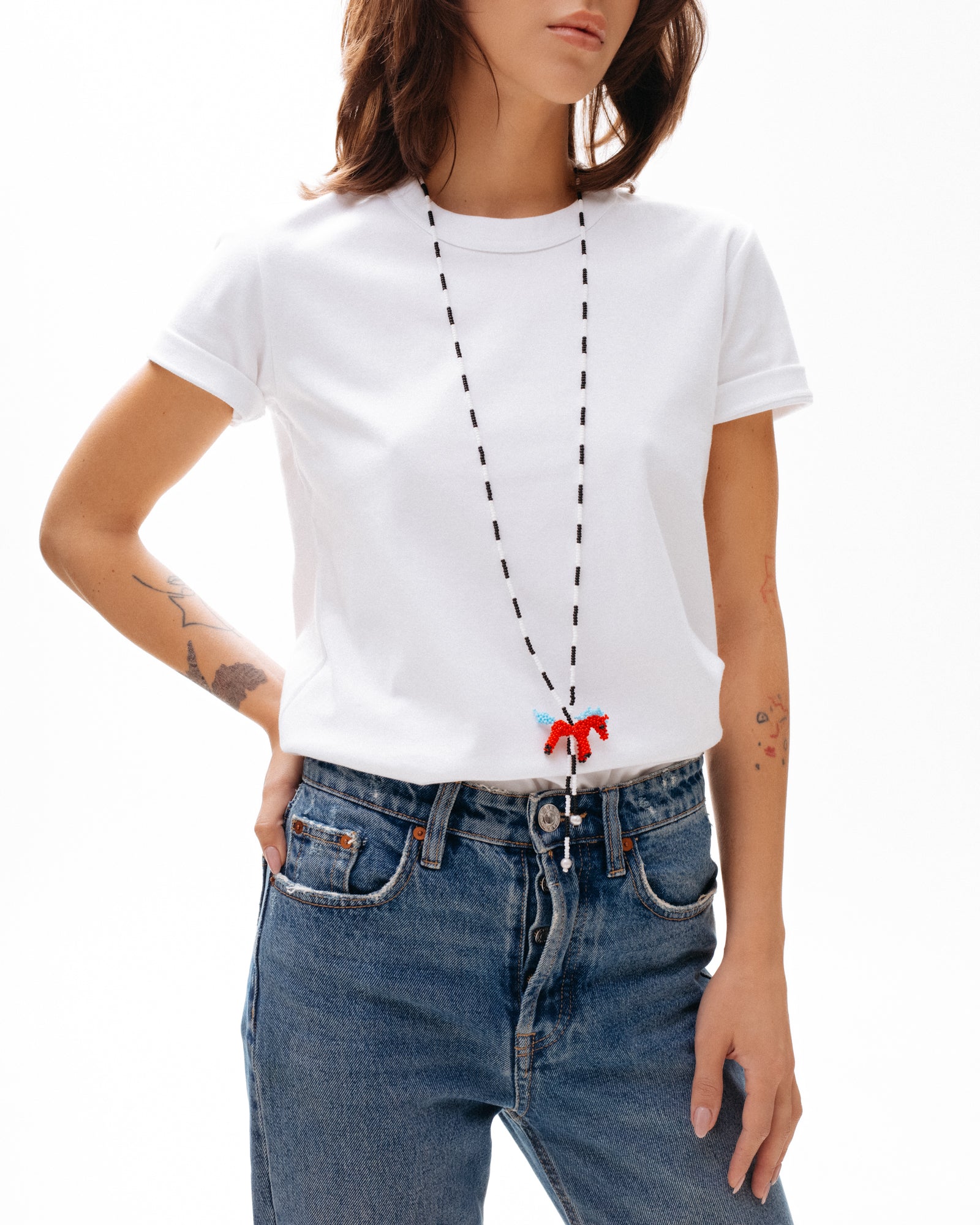A long black and white necklace with a beaded figurine of a red horse, the symbol of 2026. A great choice for New Year's Eve and all winter holidays.