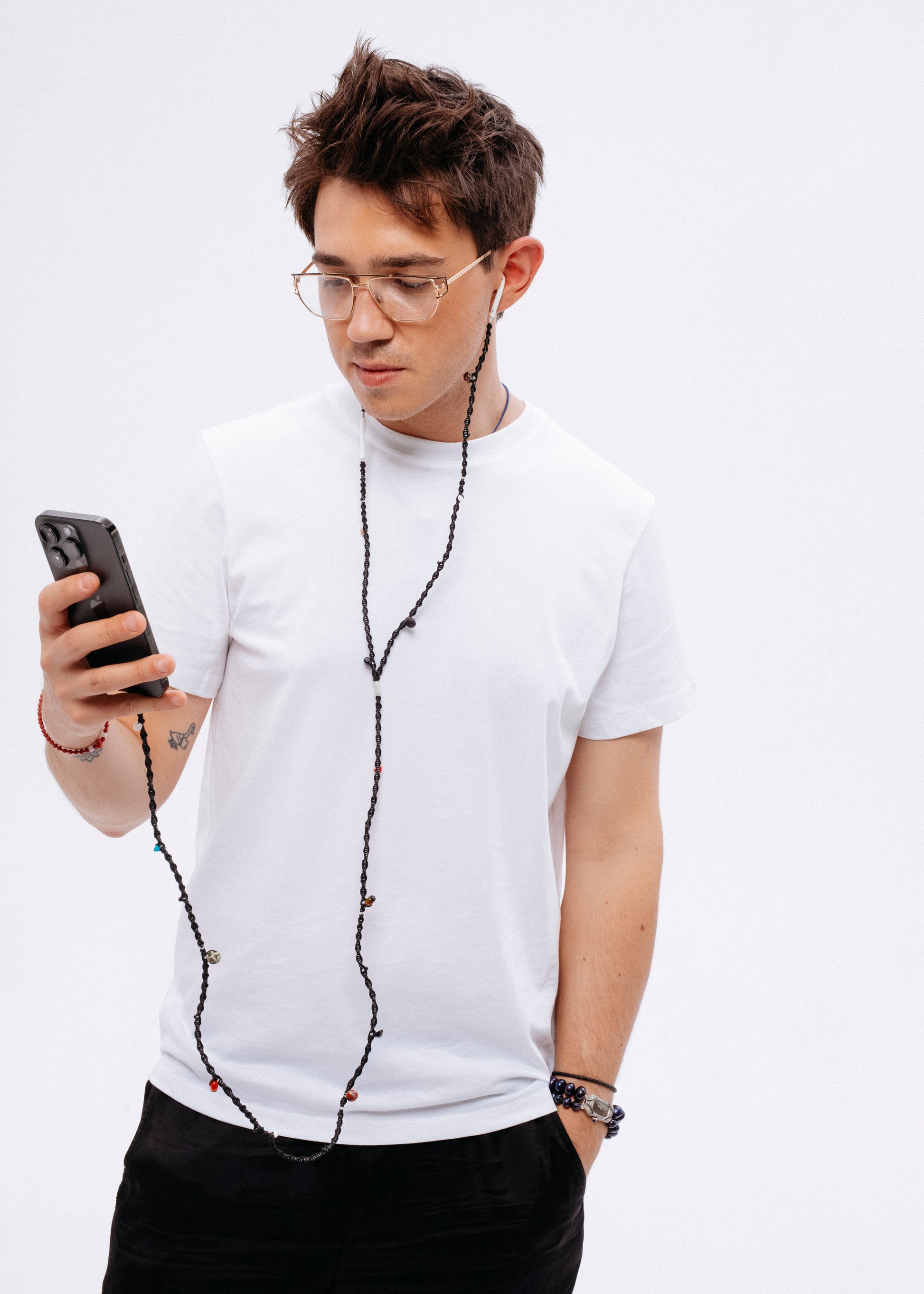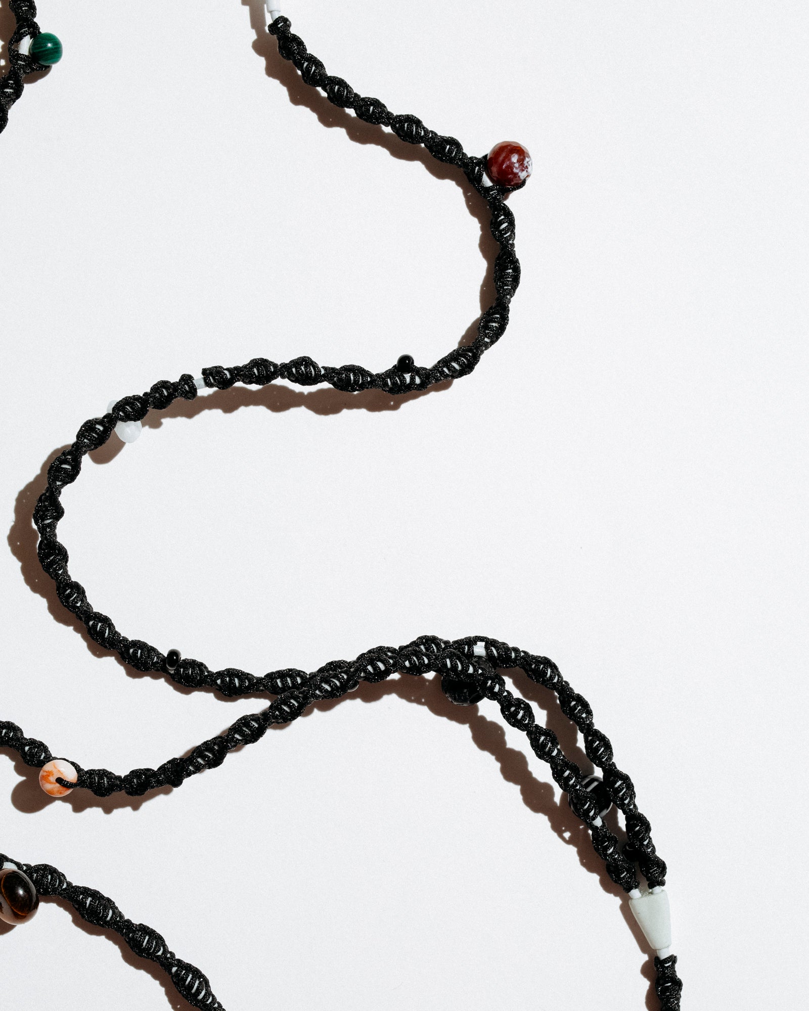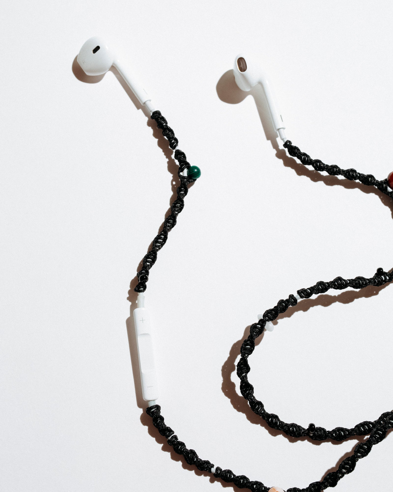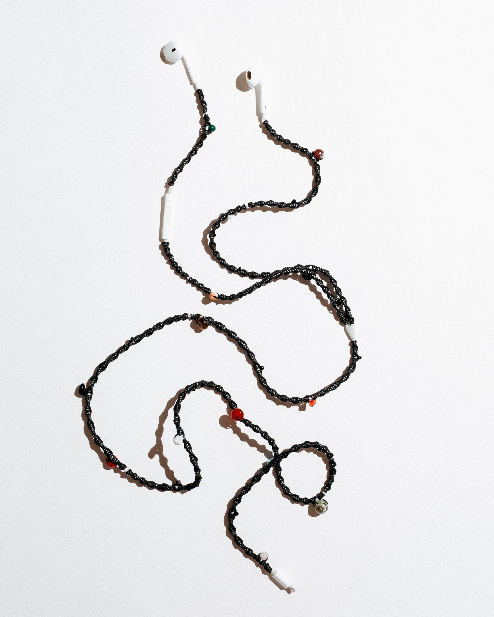 These handcrafted headphones are intricately wrapped in a black nylon thread, adorned with a variety of semi-precious stones and minerals. The unique design combines functionality with aesthetic appeal, ensuring durability and strength through meticulous craftsmanship. Each pair is made with careful attention to detail, promising long-lasting use. The blend of natural stones adds a touch of elegance, making these headphones not just a tech accessory, but a statement piece as well.