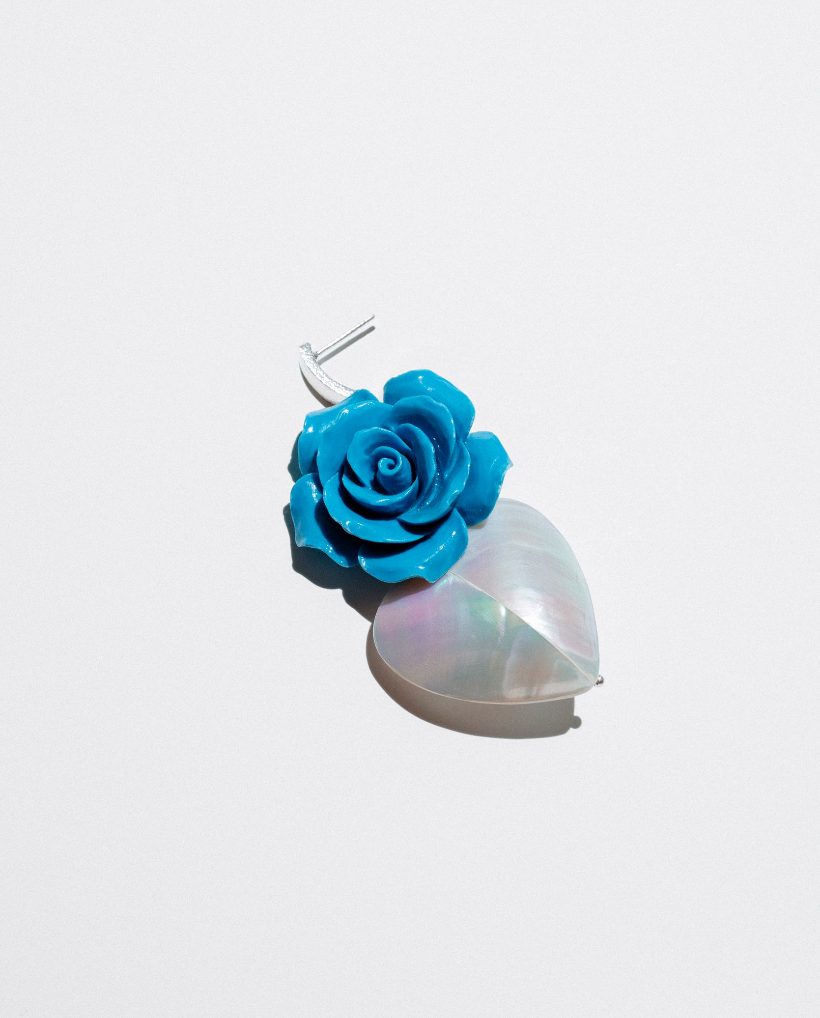 The Blossom Heart Earring is a delicate and romantic piece that merges the beauty of a blooming flower with the softness of a heart. Available in two colors, it features a beautifully crafted rose and a mother-of-pearl heart, all finished with refined silver fittings. This unique earring is perfect for those who appreciate elegant, nature-inspired jewelry with a modern touch.