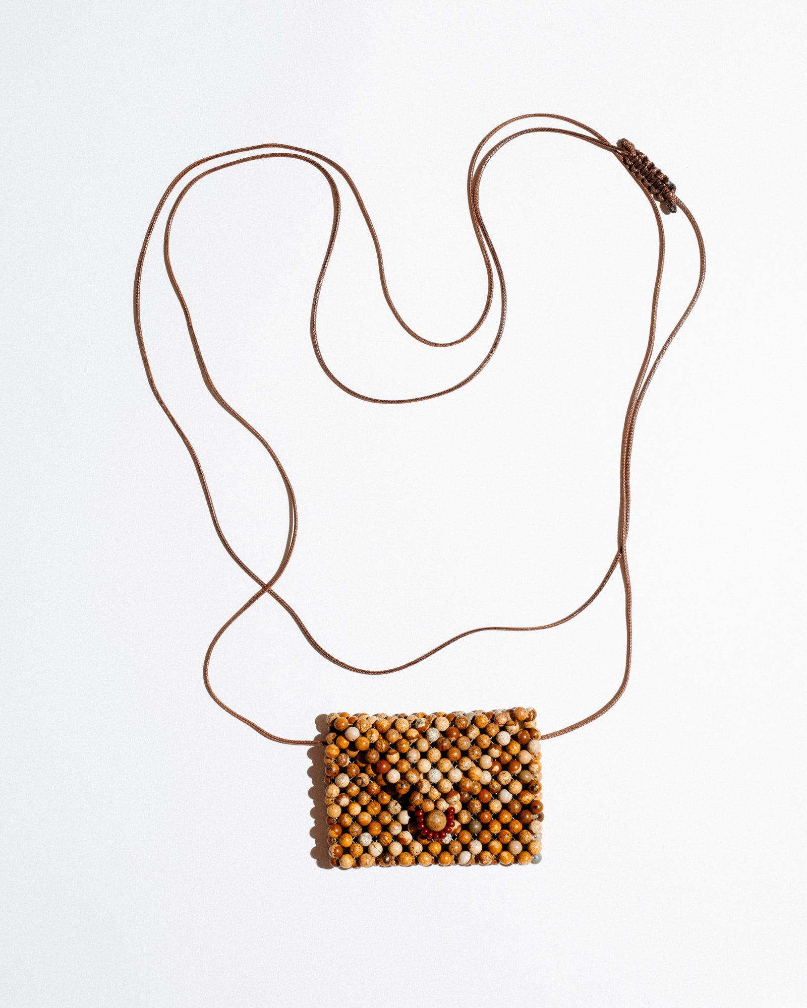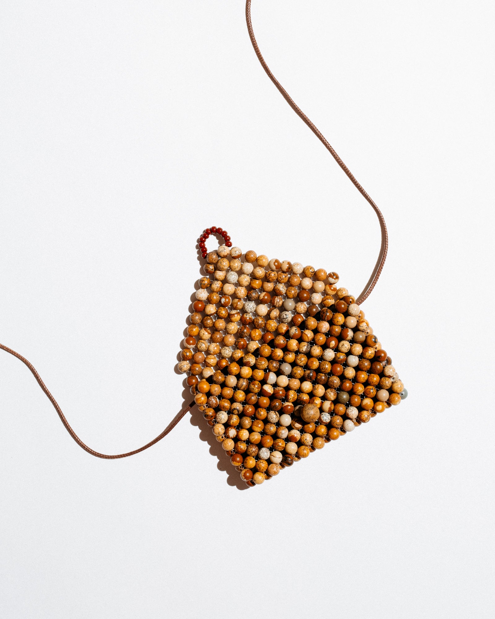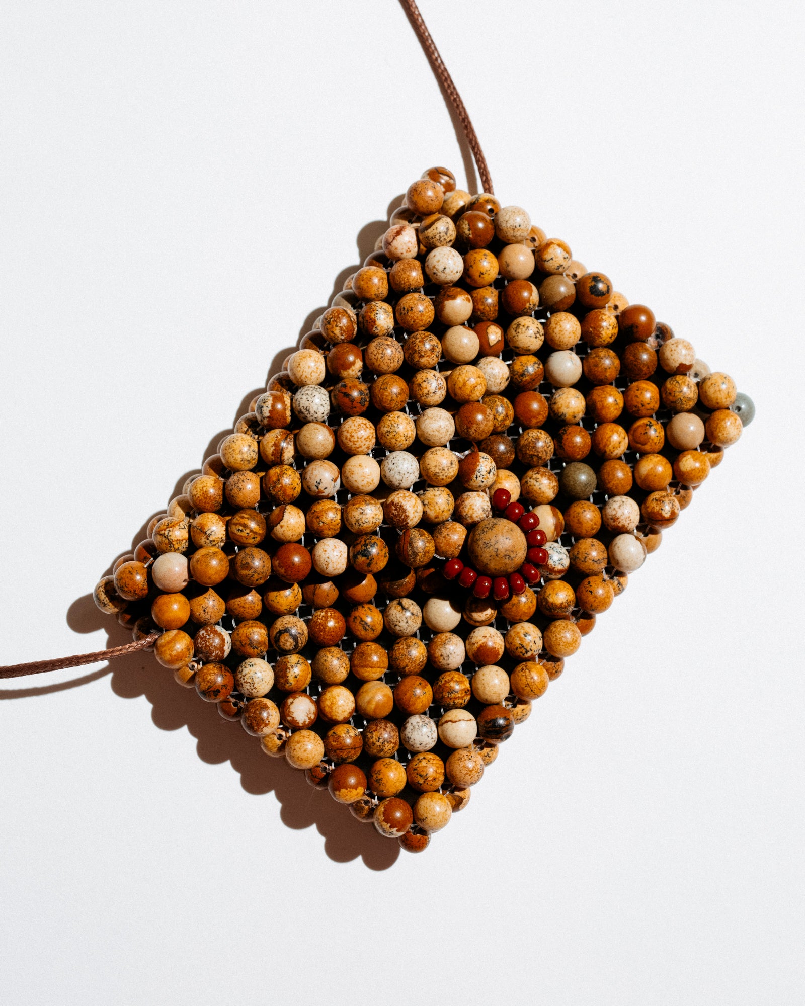 Hand-woven from polished brown jasper beads and finished with a playful glass-bead button, this tiny purse is securely knotted on an extra-long adjustable nylon thread. Slip it on as a necklace or swing it cross-body to keep earbuds, coins or other small essentials close at hand in effortless earthy style.