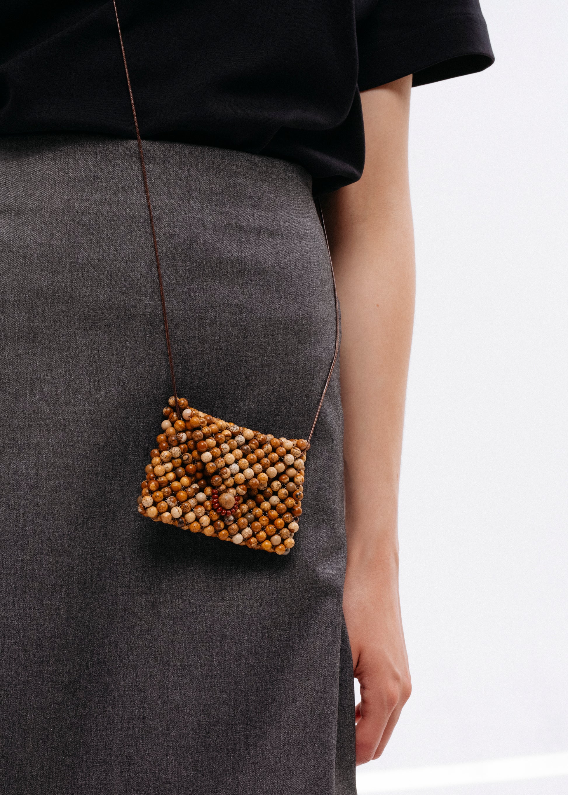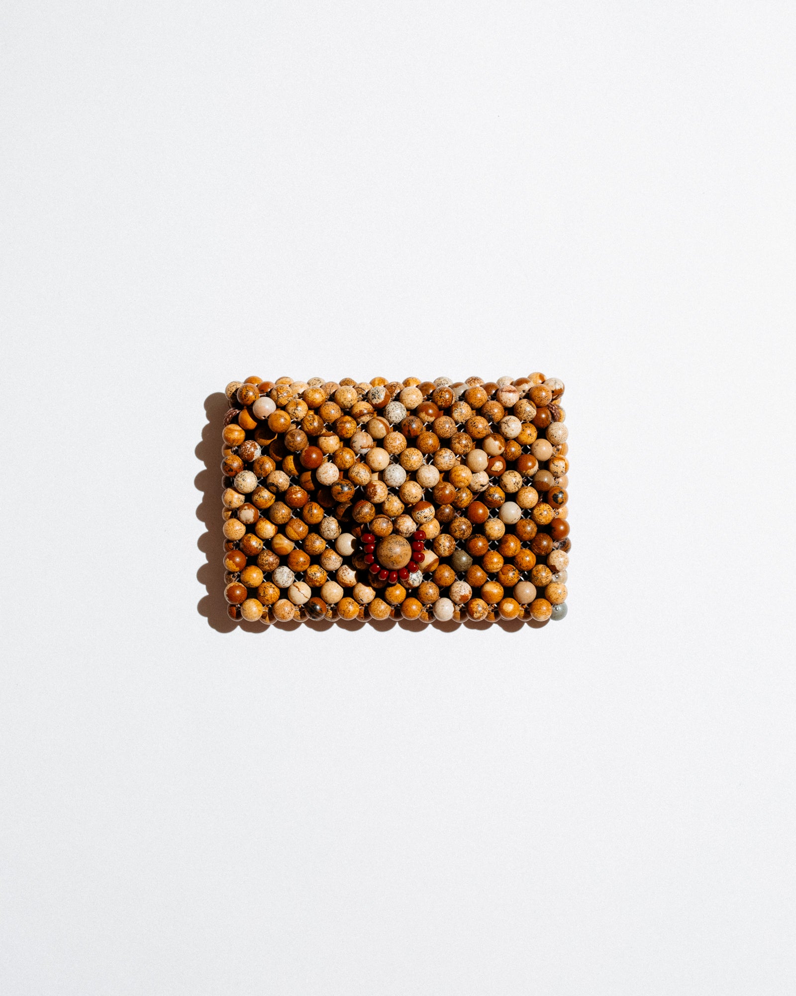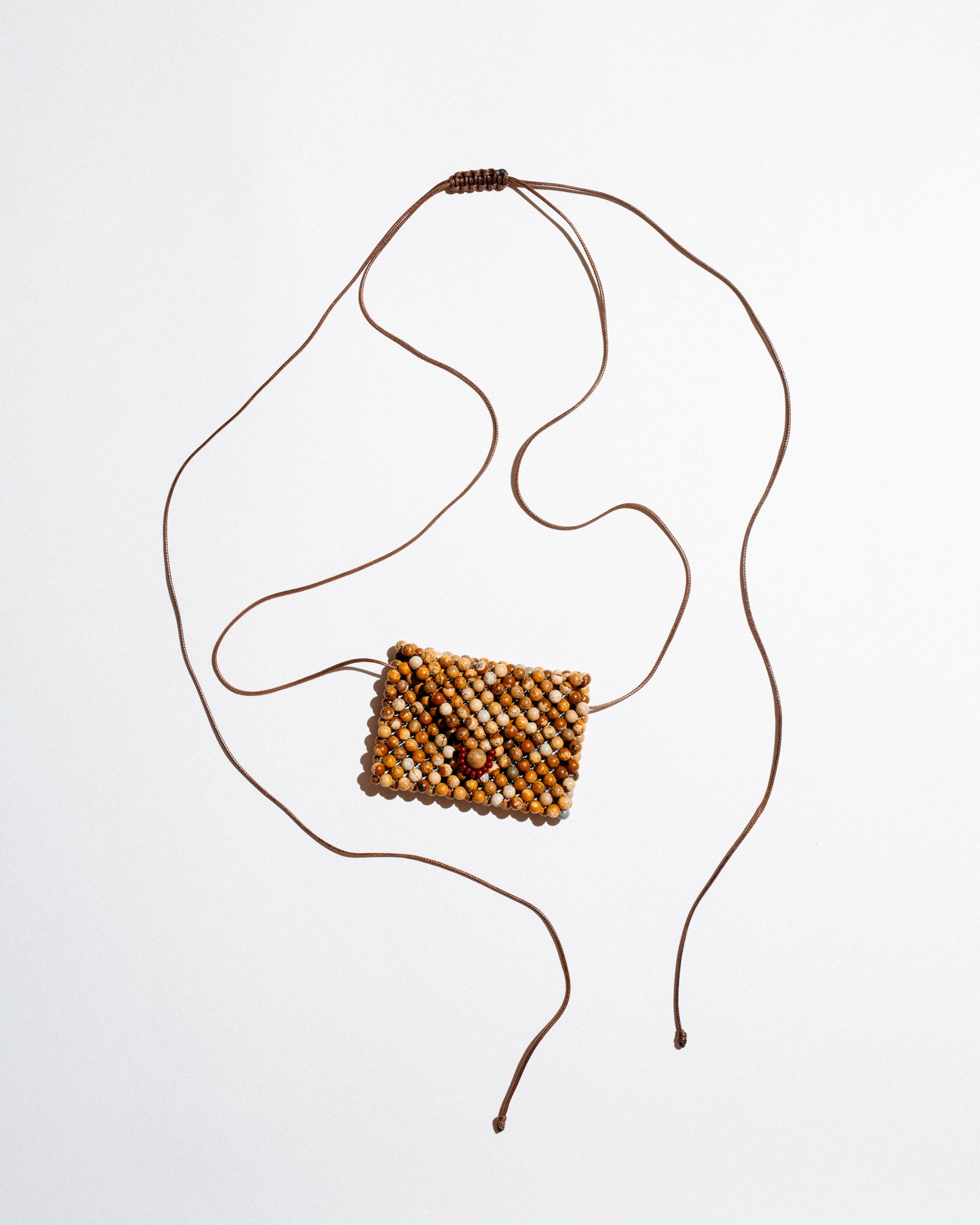 Hand-woven from polished brown jasper beads and finished with a playful glass-bead button, this tiny purse is securely knotted on an extra-long adjustable nylon thread. Slip it on as a necklace or swing it cross-body to keep earbuds, coins or other small essentials close at hand in effortless earthy style.