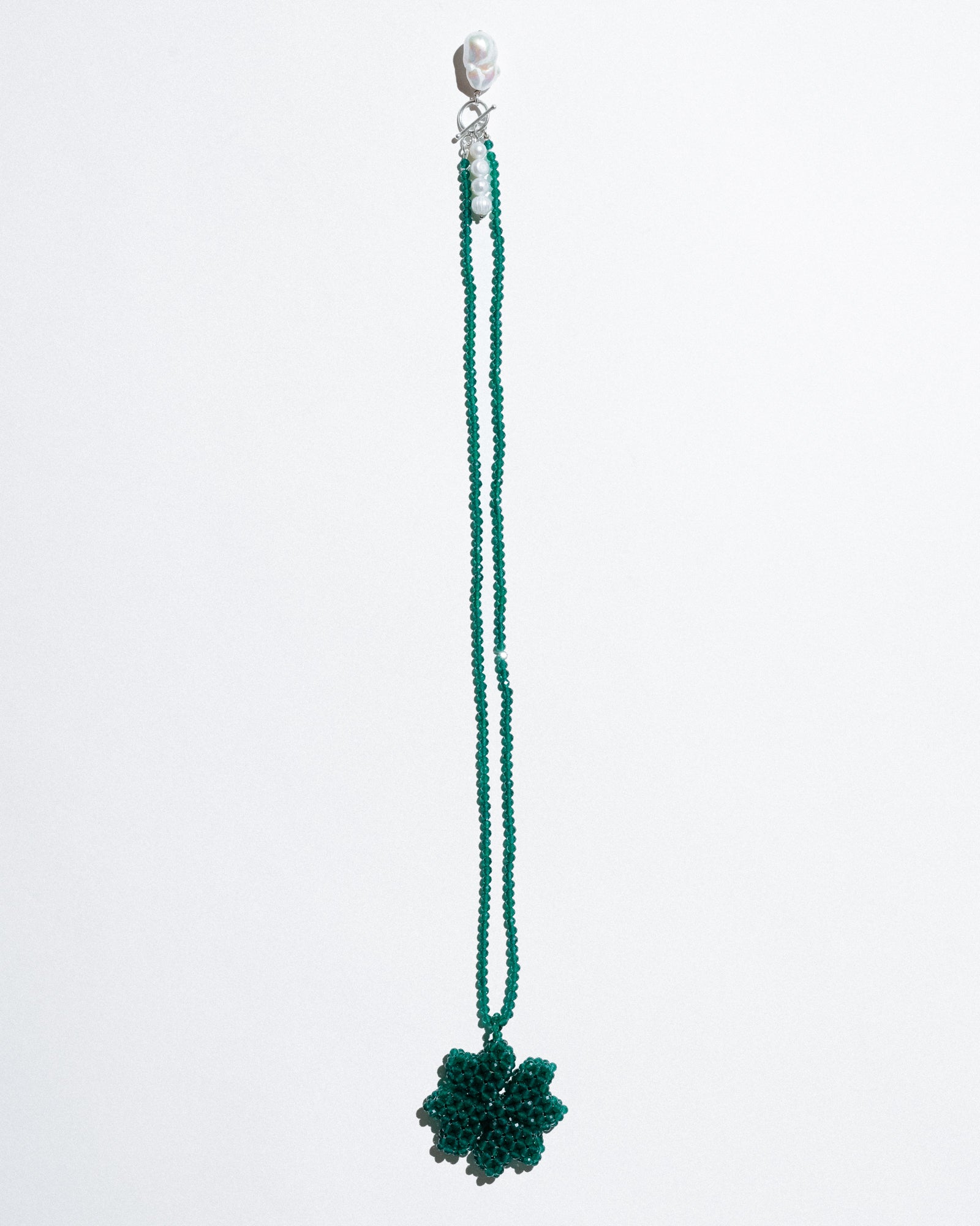 A good luck necklace on a thin, long strand of green agate with a clover-shaped pendant. It also features pearl details with a baroque pearl. Delicate, very beautiful. Luxurious.