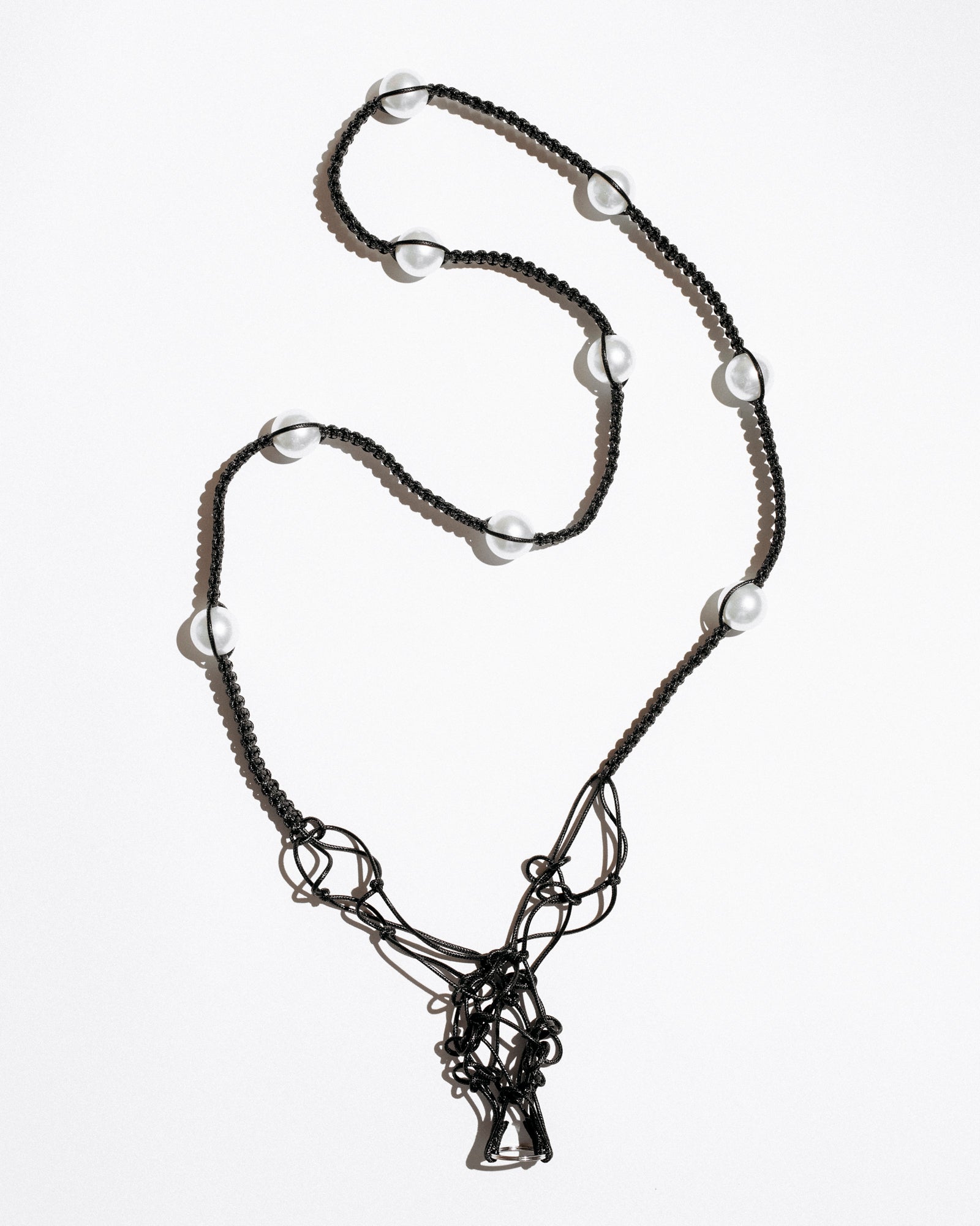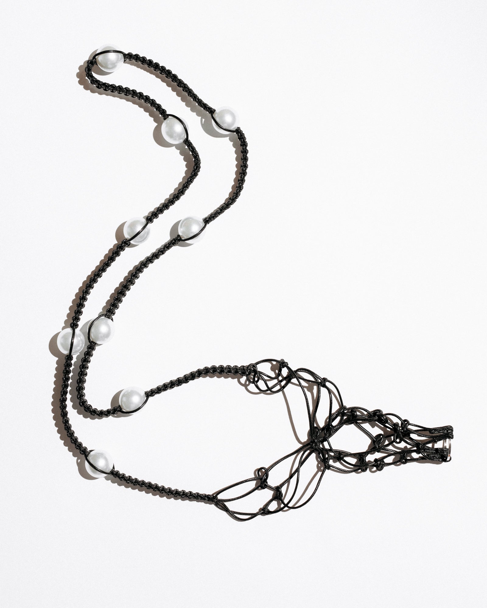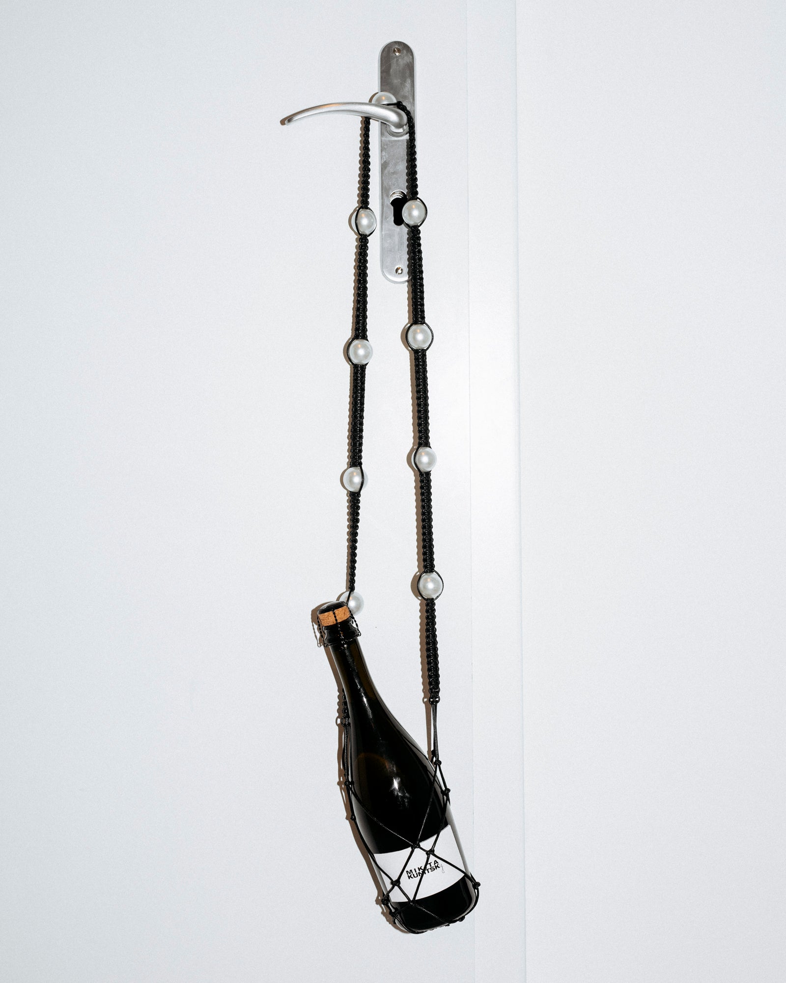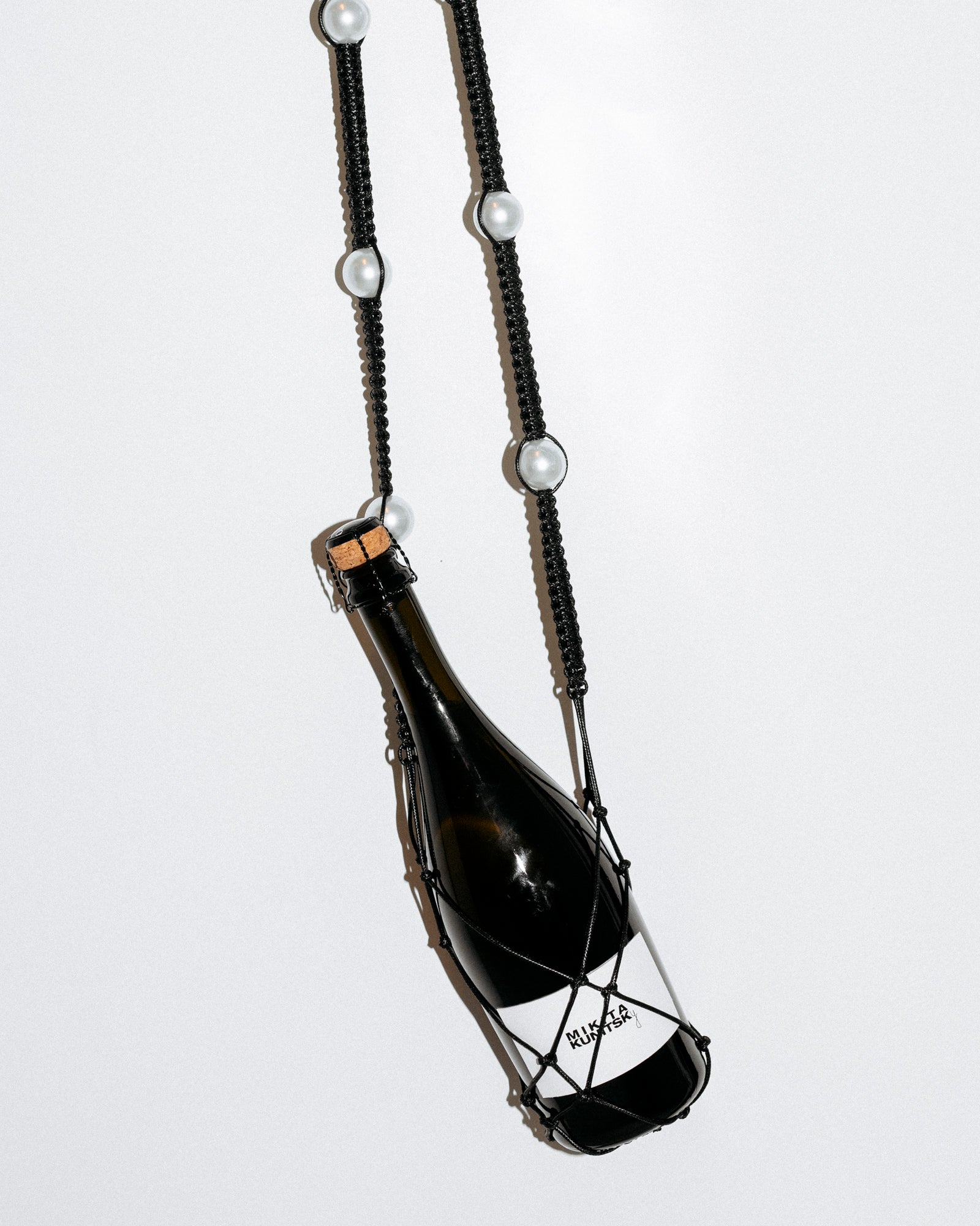 Meet Fizz Holder – a unique woven bag designed for carrying your favorite bottle of sparkling wine. This statement accessory blends aesthetics with functionality, making it perfect for those who appreciate stylish details. The durable cord is intricately handwoven, while giant artificial pearls add a touch of elegance and contrast.