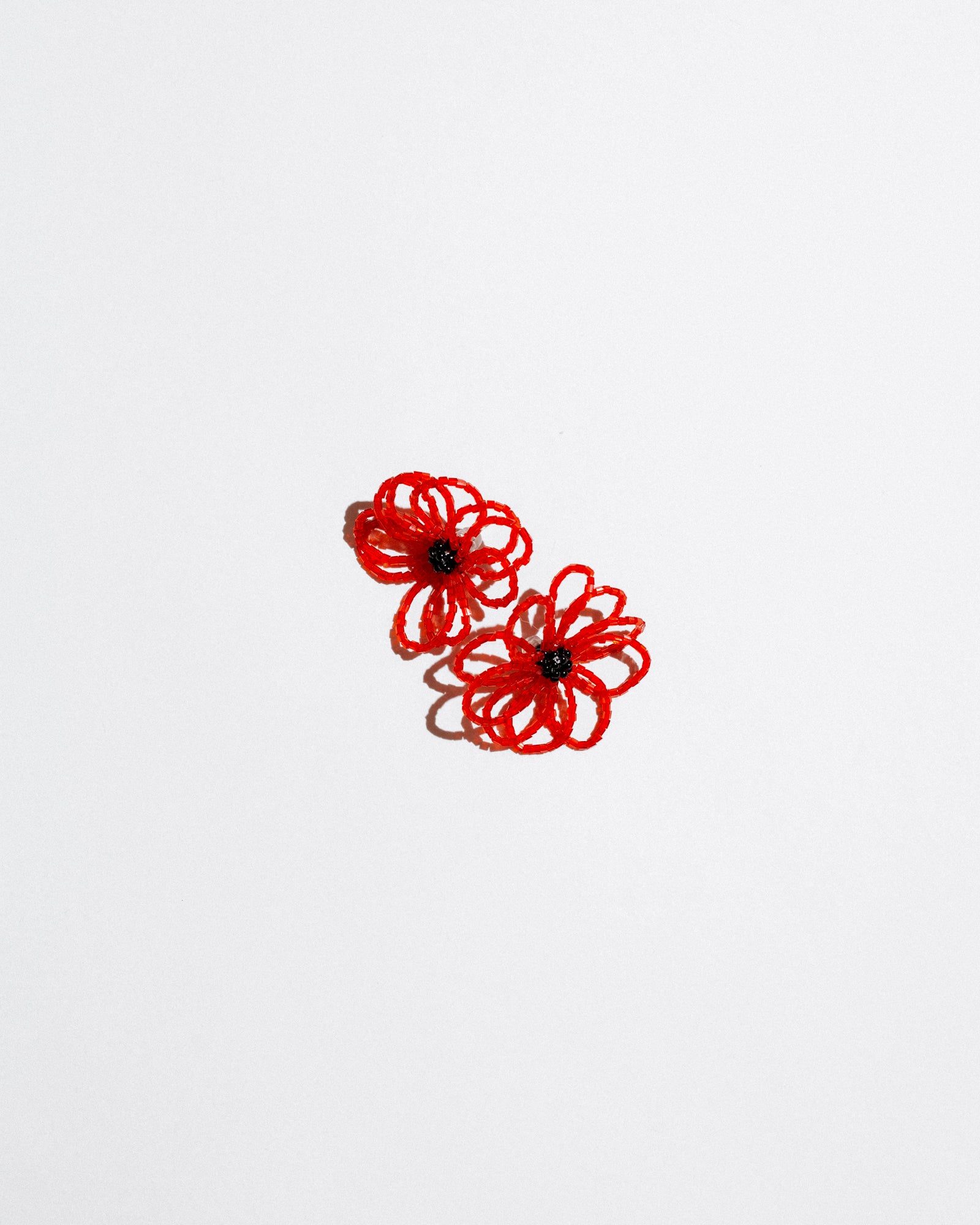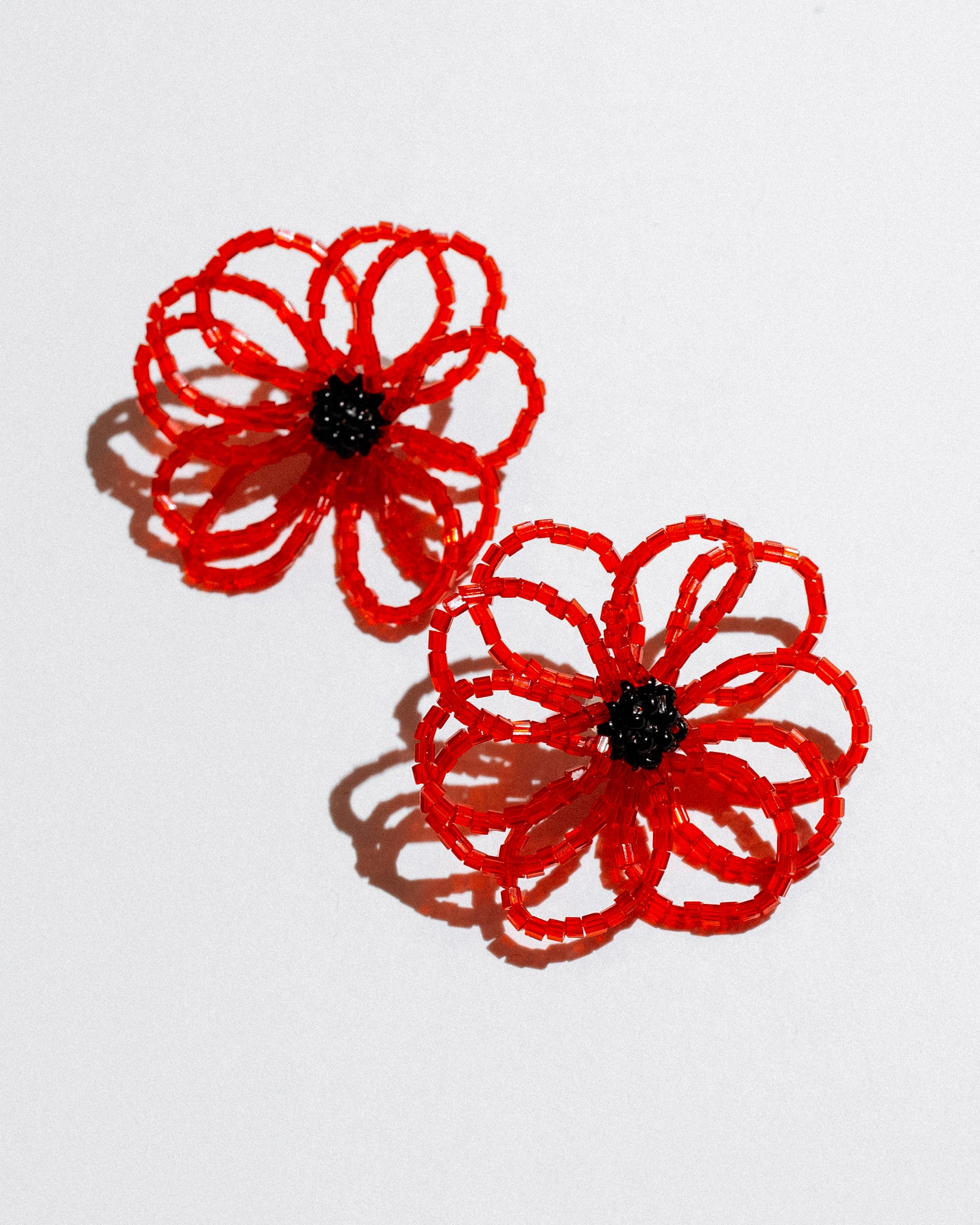A bold floral statement in a lightweight beaded design. These handcrafted earrings feature intricate red petals with a striking black center, reminiscent of a blooming poppy. A perfect fusion of artistry and elegance, designed to bring a vibrant touch to any look.