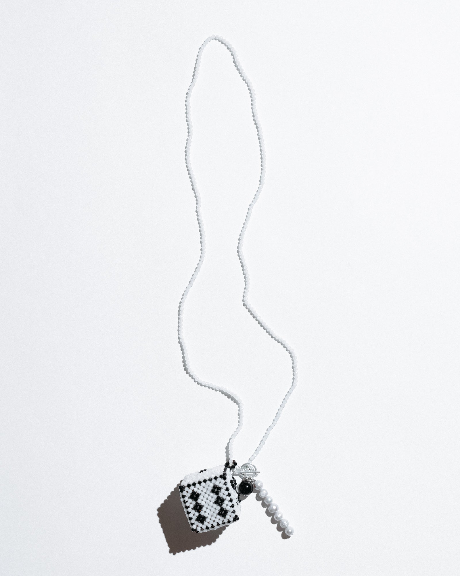 A long-strand necklace with a large dice-shaped charm. This piece was inspired by classic dice and vintage playing cards, with the addition of our signature gray pearl detail.