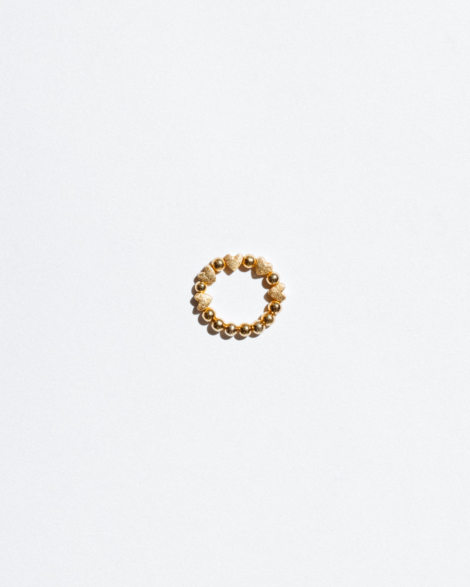 Added a gold tube to a ball ring to create a new, interesting design. We added new elements to the ring—hearts. It turned out to be a very beautiful, romantic piece. The ring is on a one-size-fits-all elastic band.