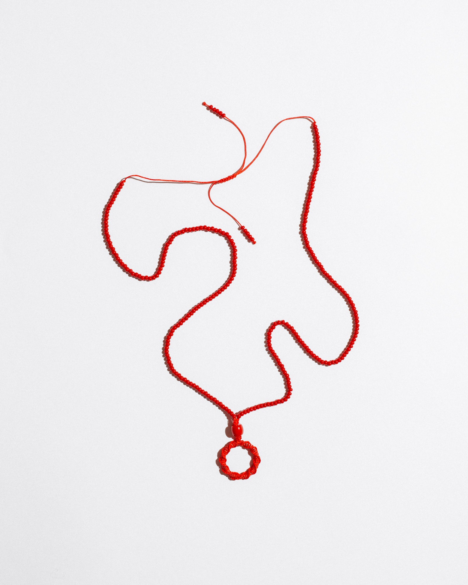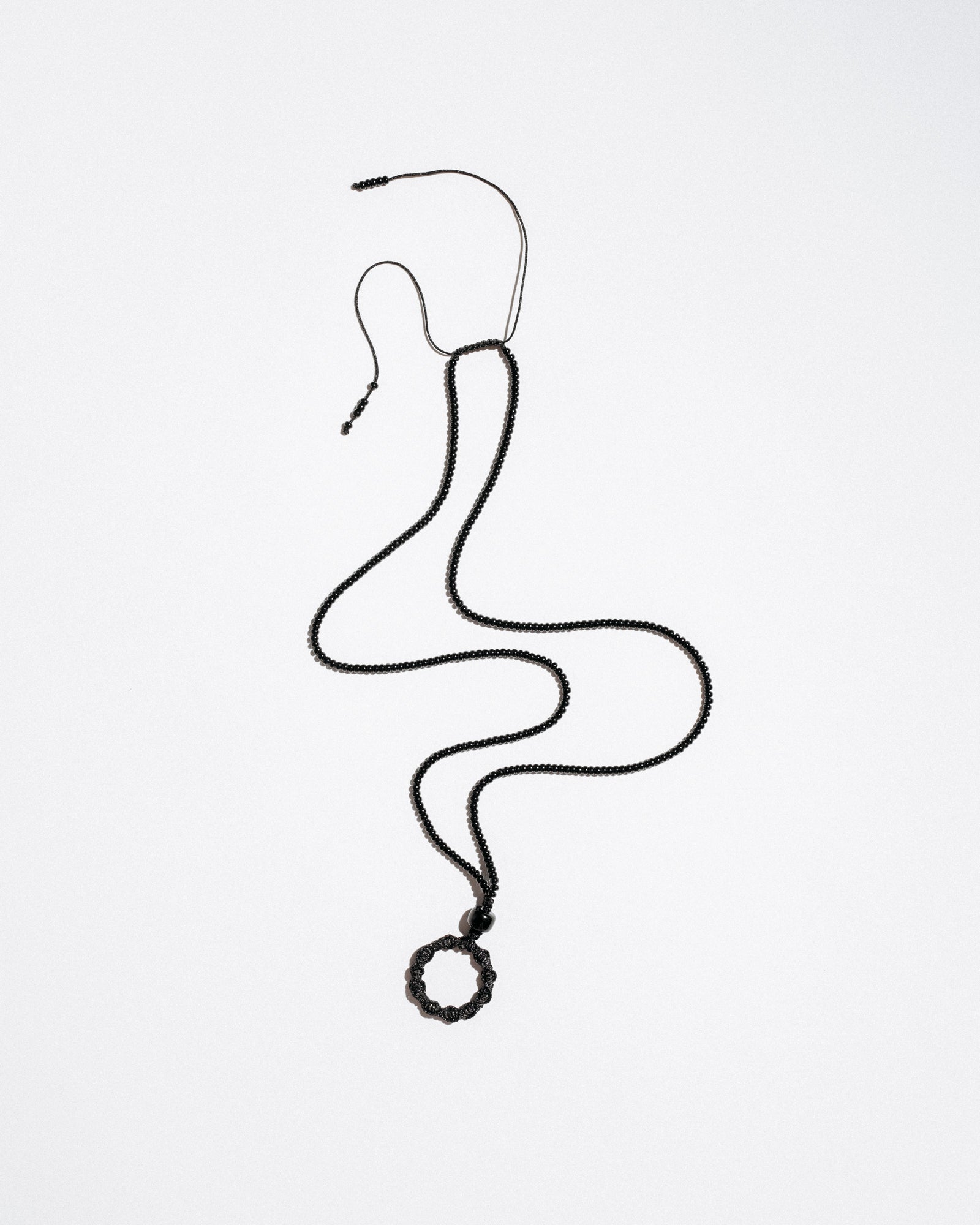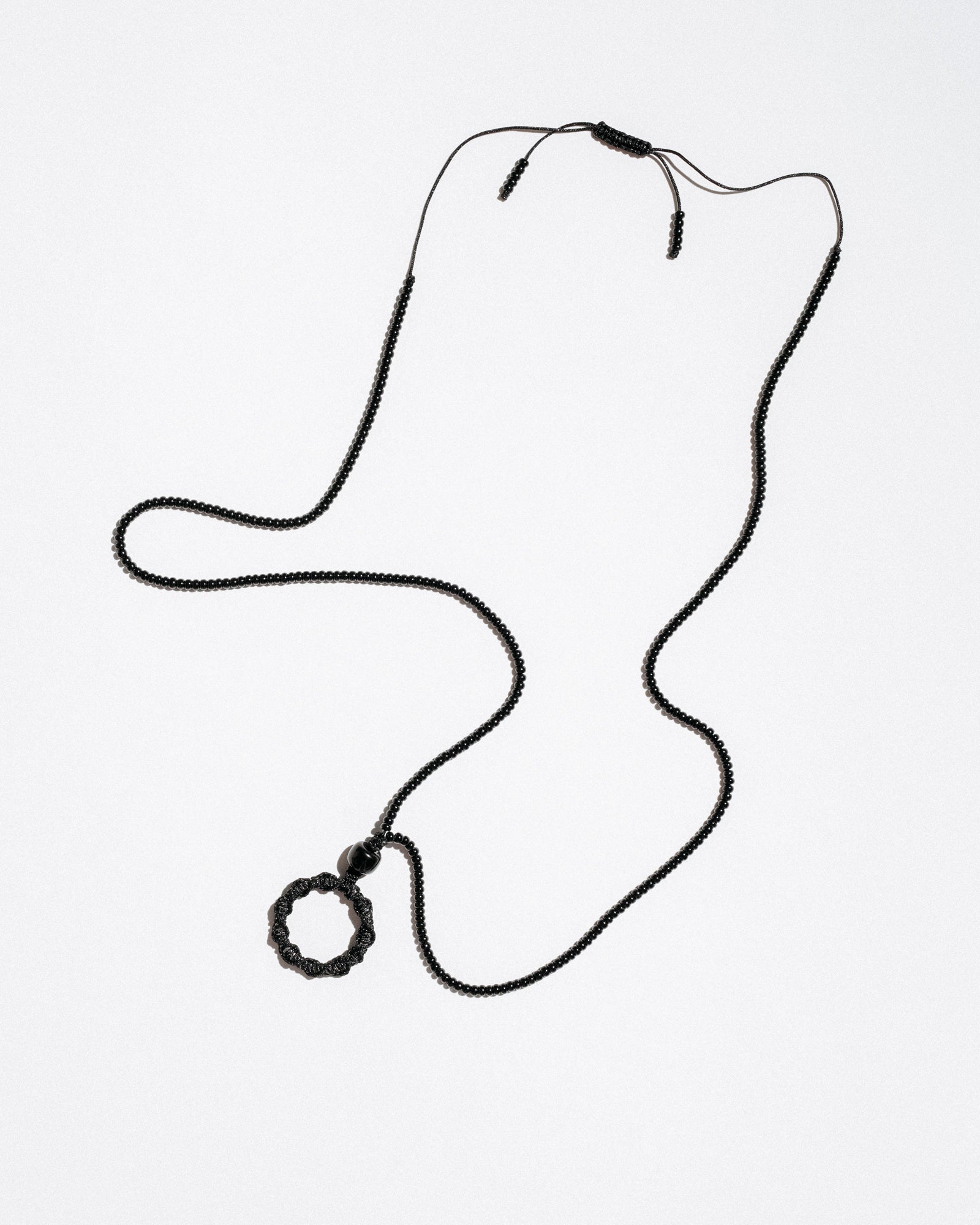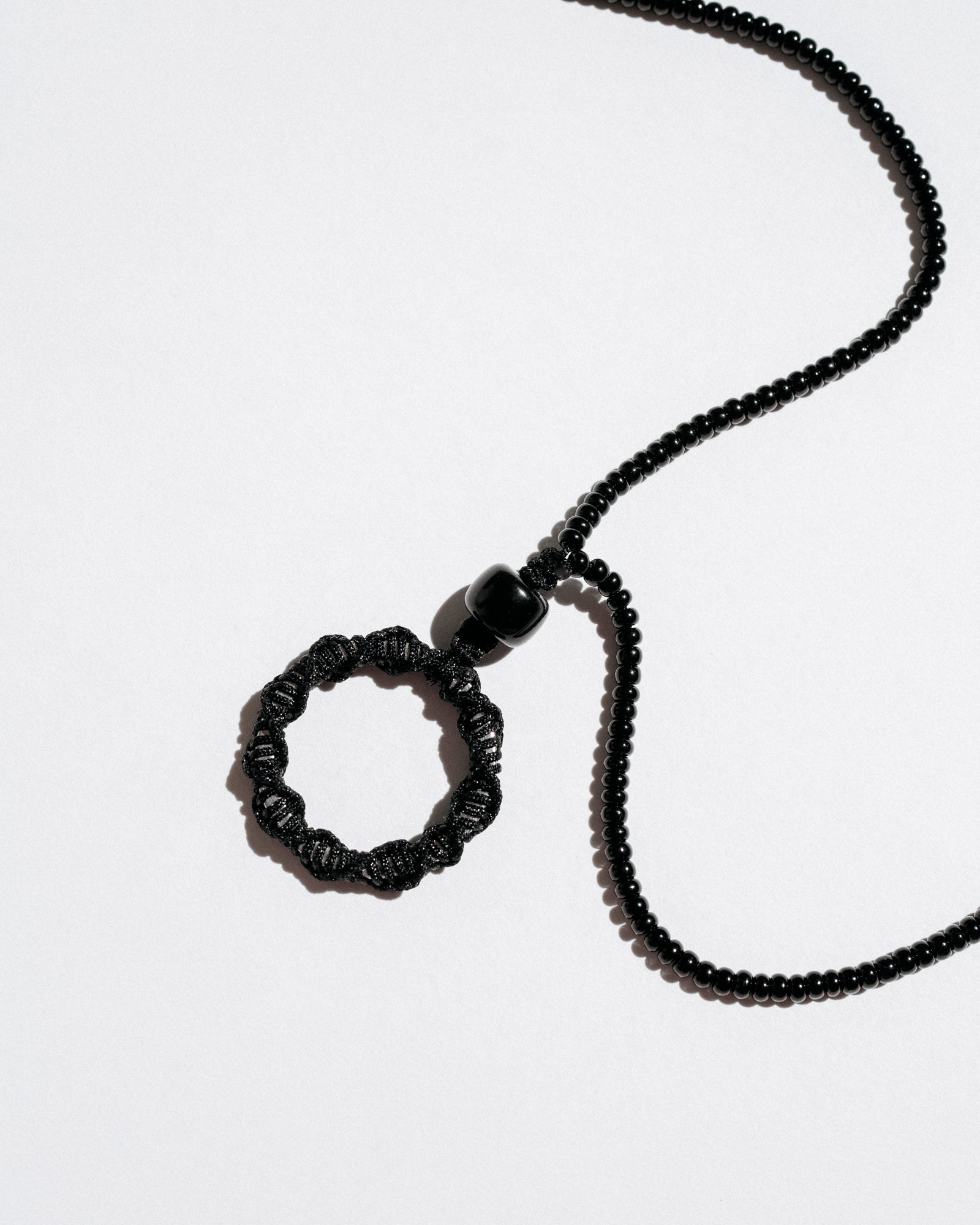 Mono Circle Brillenkette is a bold, functional accessory designed to hold your glasses with style. Featuring a hand-beaded cord and an integrated steel ring wrapped in nylon, it also works as a base for charms or keys — or can be worn solo as a sculptural necklace. Its adjustable length ensures comfort and versatility.