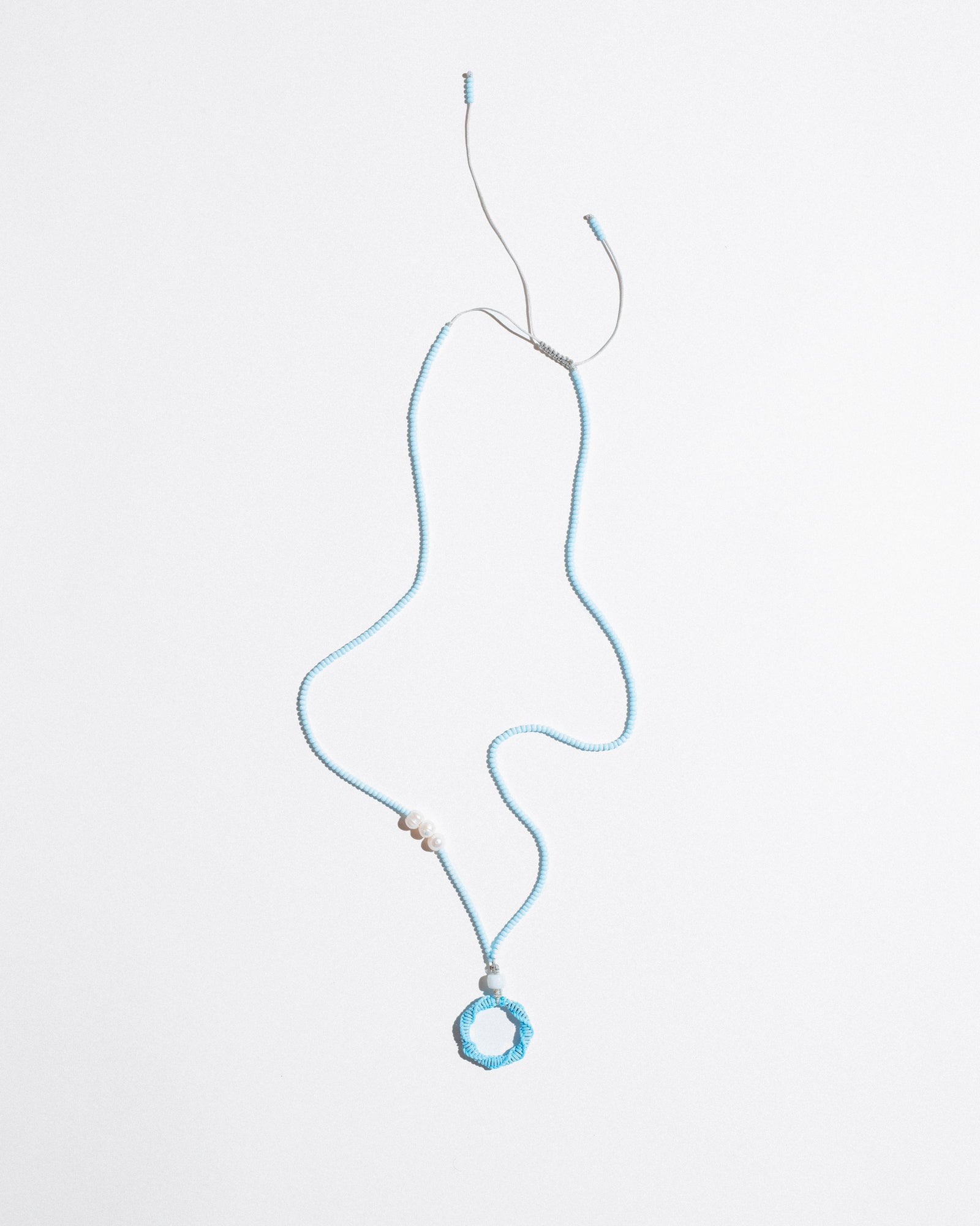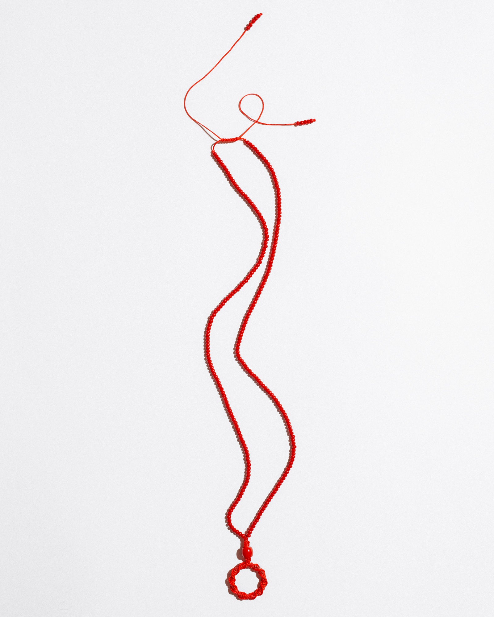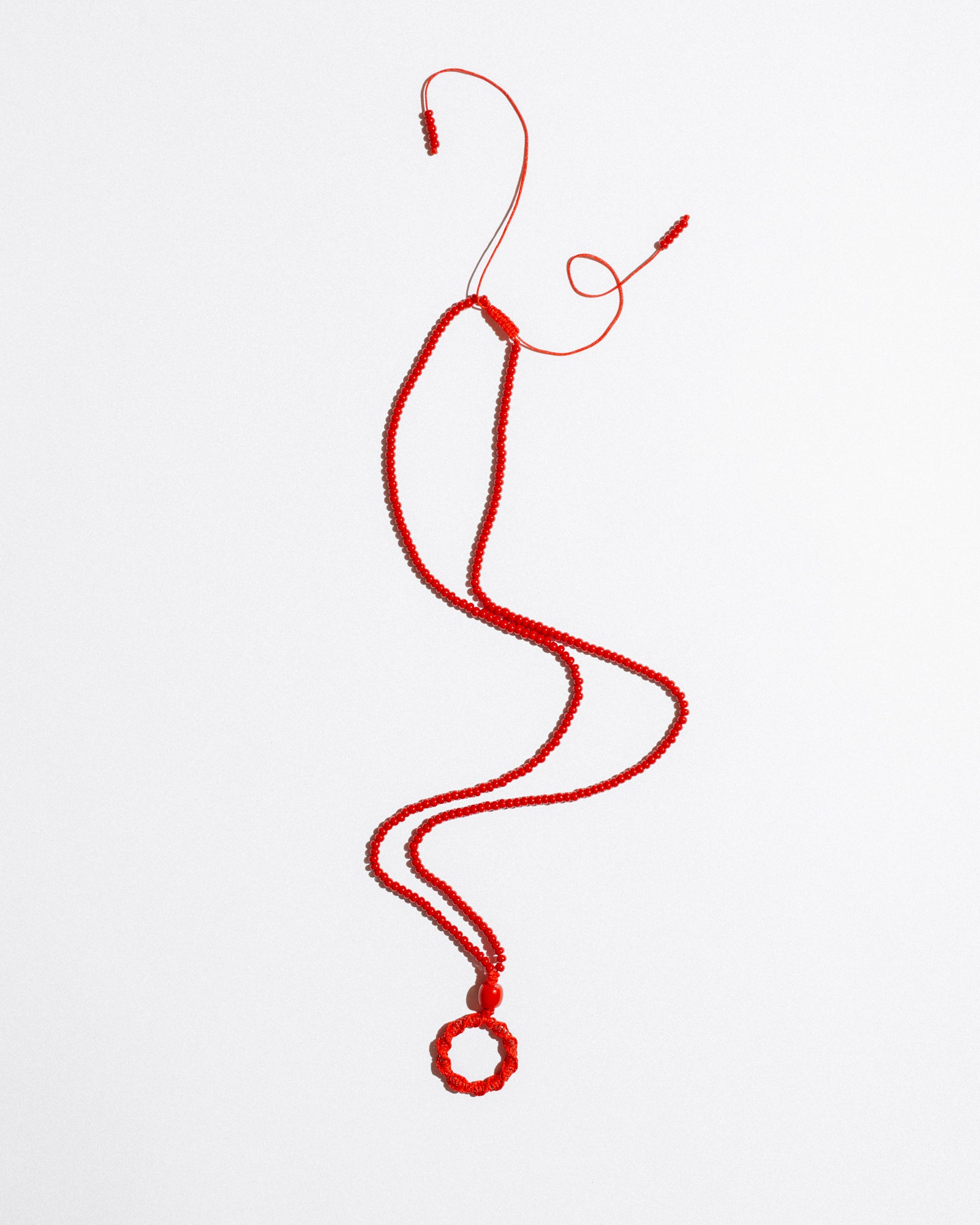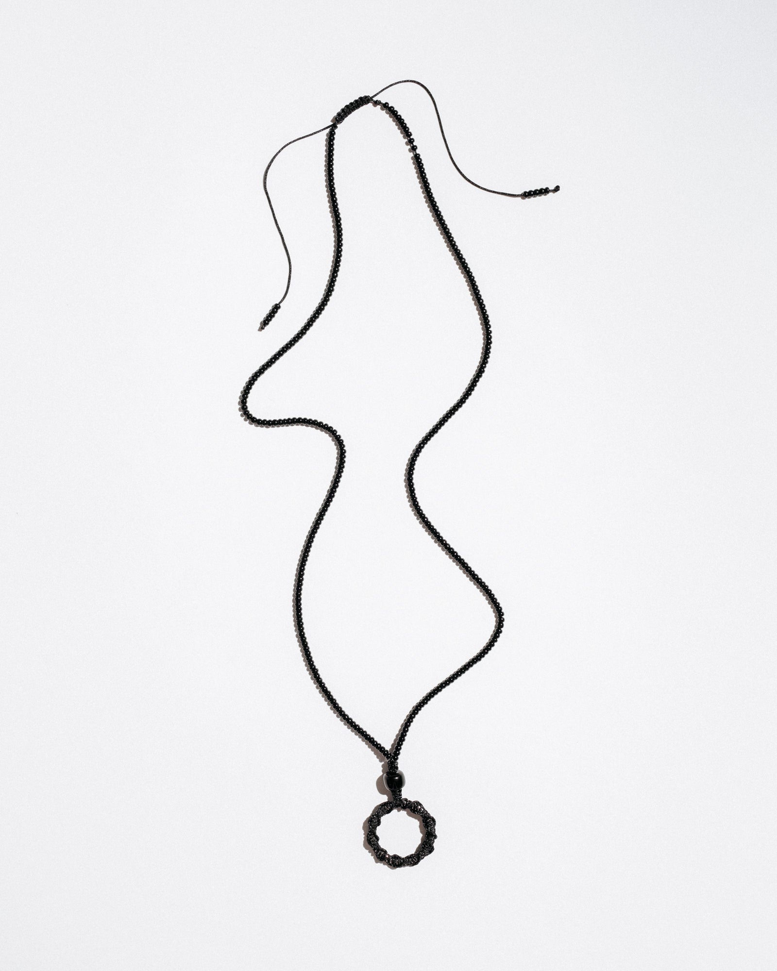 Mono Circle Brillenkette is a bold, functional accessory designed to hold your glasses with style. Featuring a hand-beaded cord and an integrated steel ring wrapped in nylon, it also works as a base for charms or keys — or can be worn solo as a sculptural necklace. Its adjustable length ensures comfort and versatility.