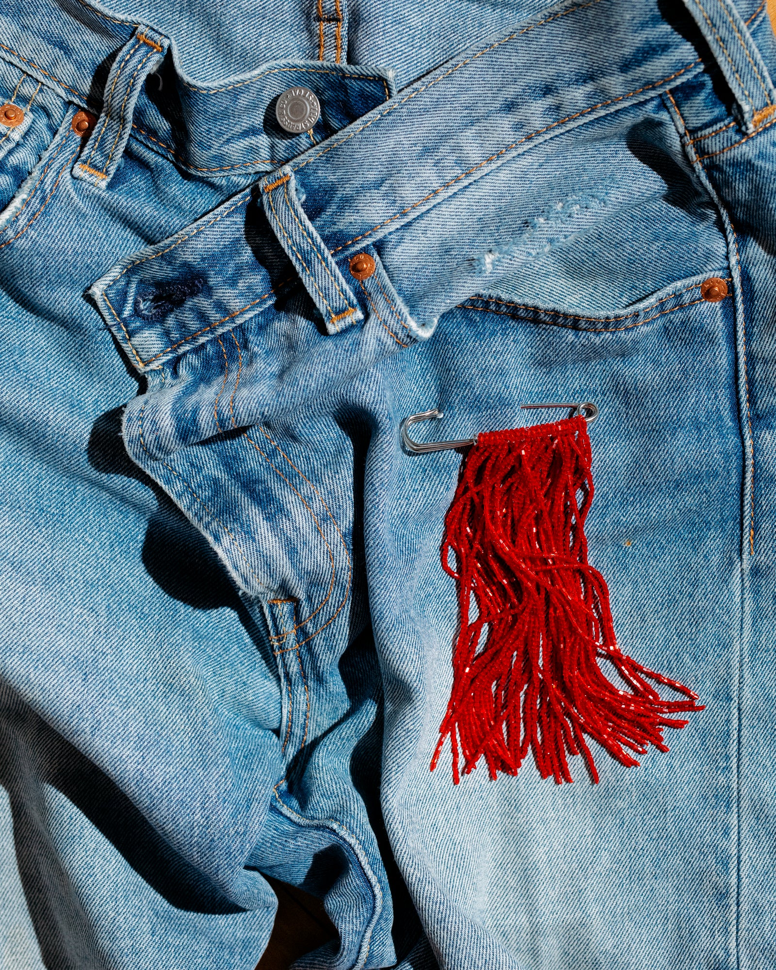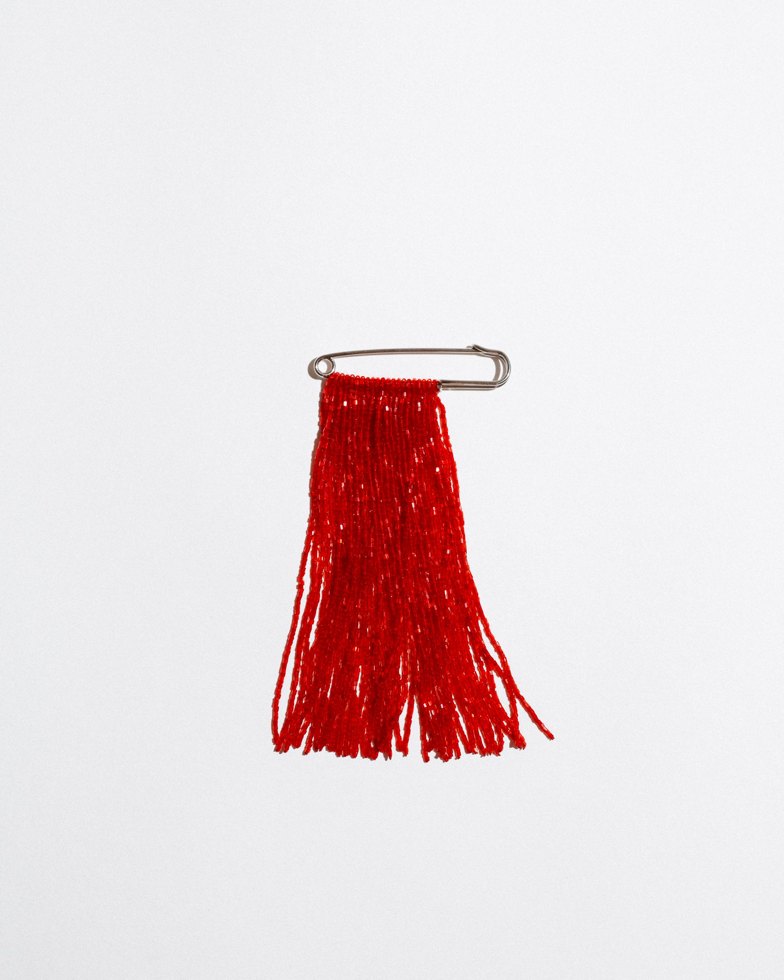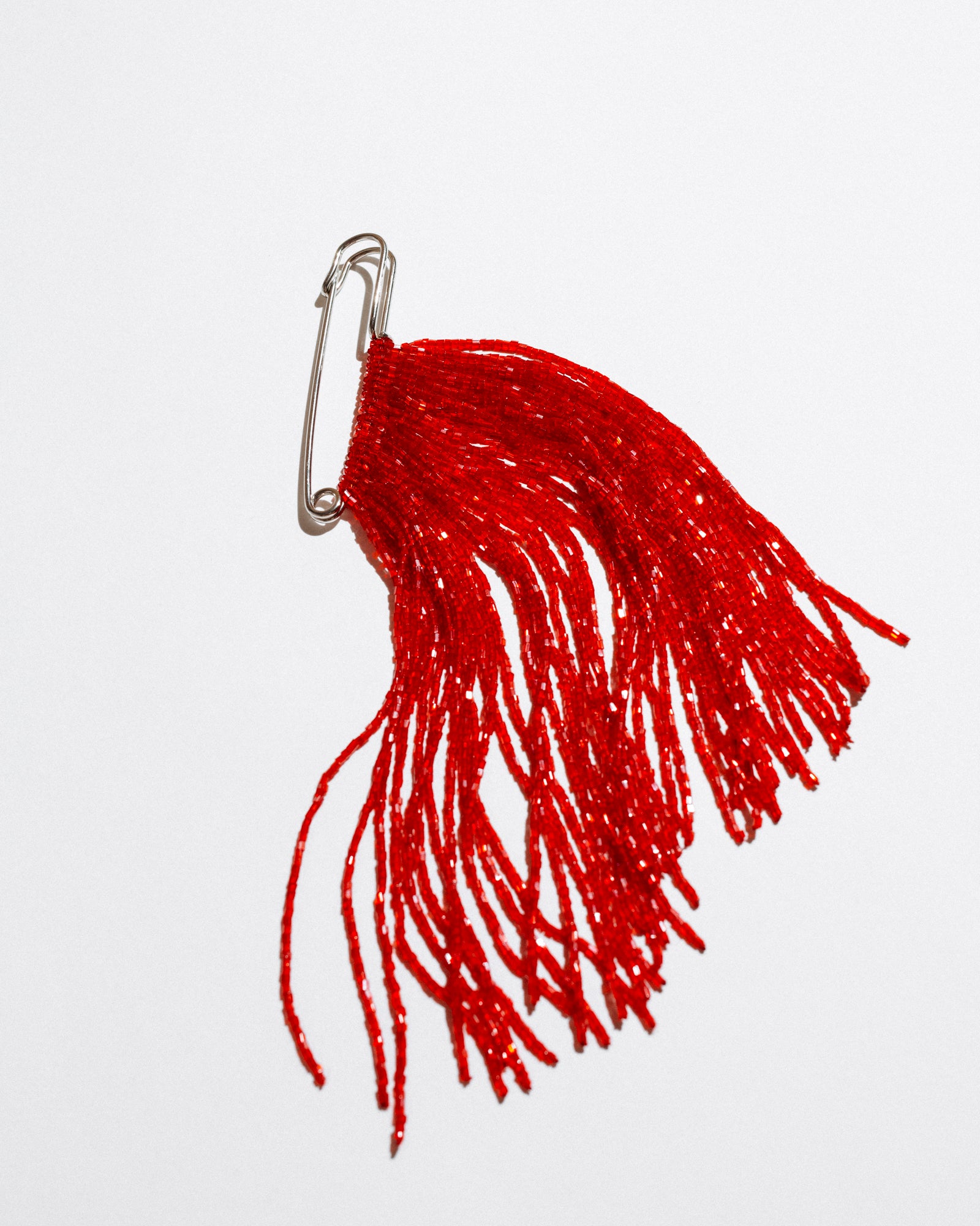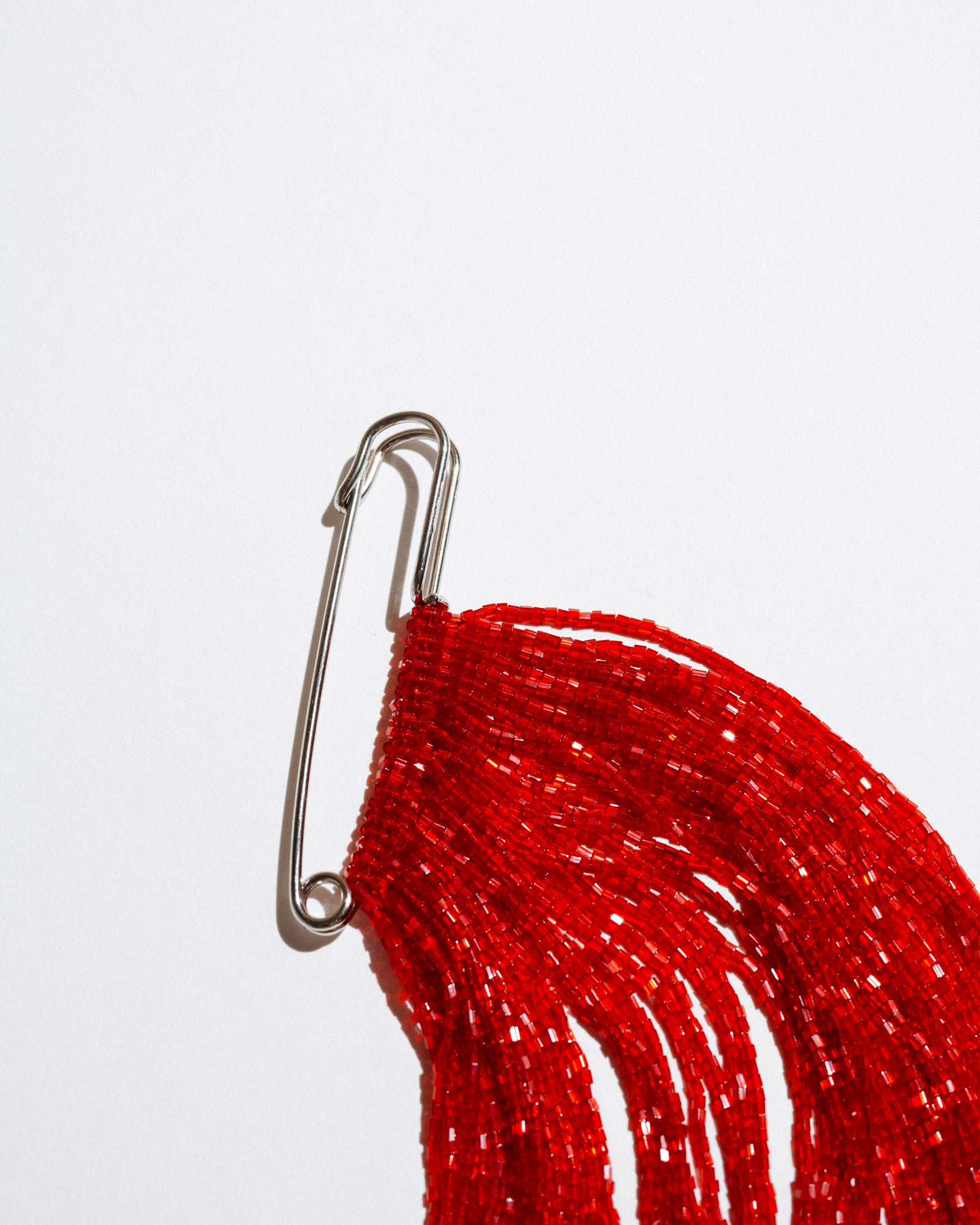 A statement brooch that fuses punk attitude with fluid movement. Delicate strands of red beads cascade from a sleek metal safety pin, creating a striking contrast between industrial edge and artisanal craftsmanship. A bold, rebellious accessory designed to stand out.
