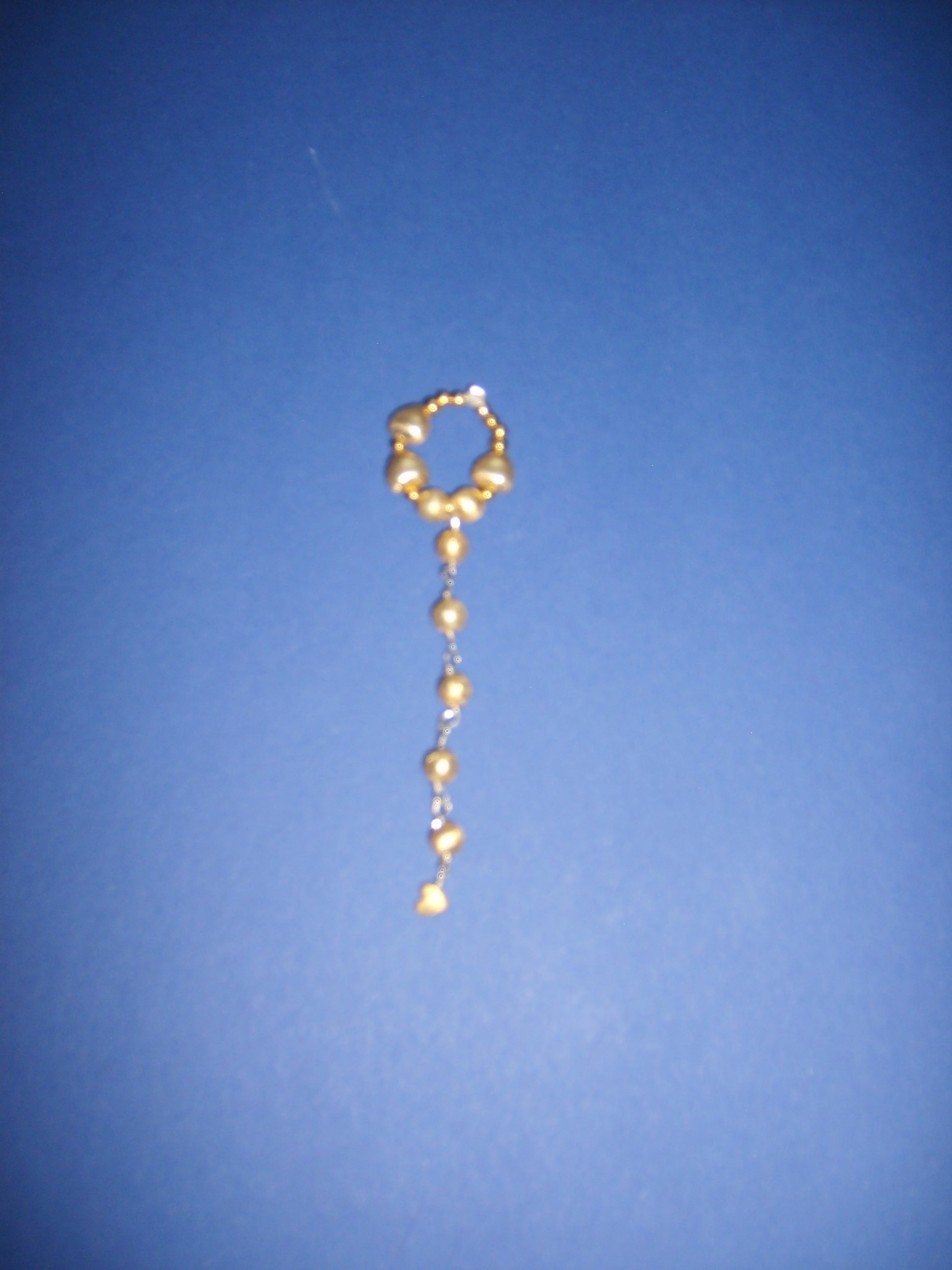 Ring made of gold plated ball with long element. The ring is on a one-size-fits-all elastic band.