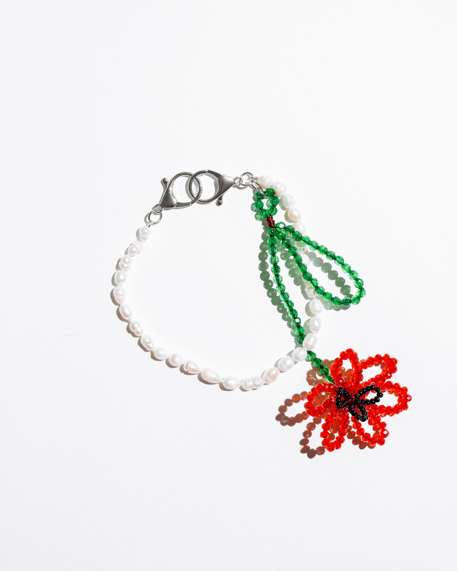 Freshwater pearl keychain with scarlet flower charm. Very beautiful, delicate piece. It is conveniently fixed on the bag or jeans with two carabiners. The sturdy steel fittings ensure durability and secure attachment to your keys or any accessory.