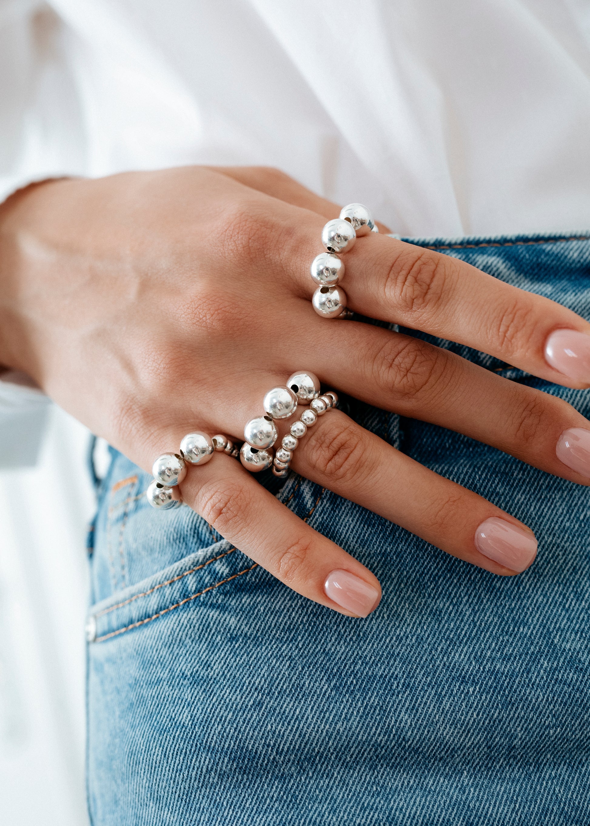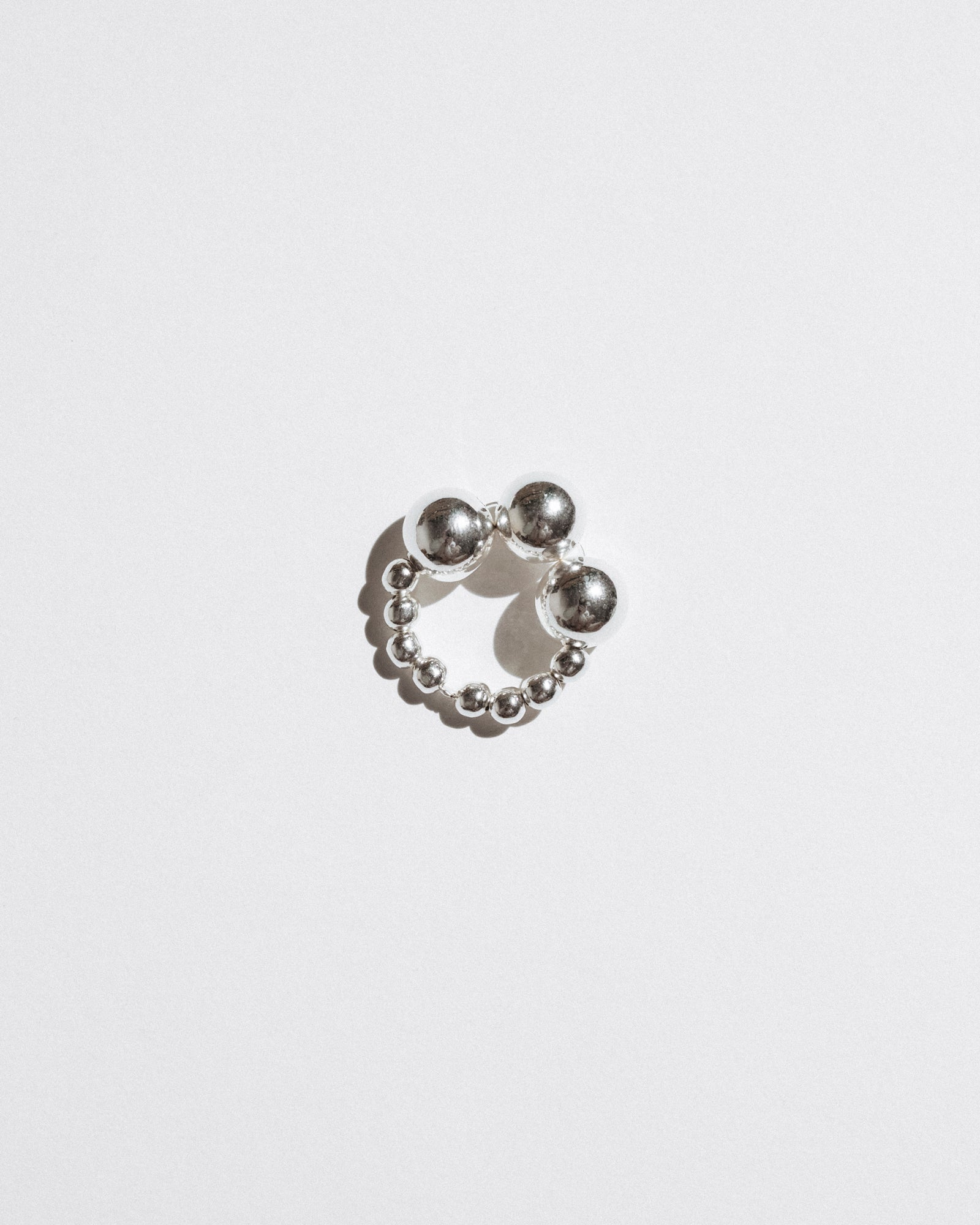 Achieve a unique look with this handmade Silver Trio Ring. This intricately crafted piece is sure to be unforgettable. Constructed with silver beads, it will enhance any ensemble.