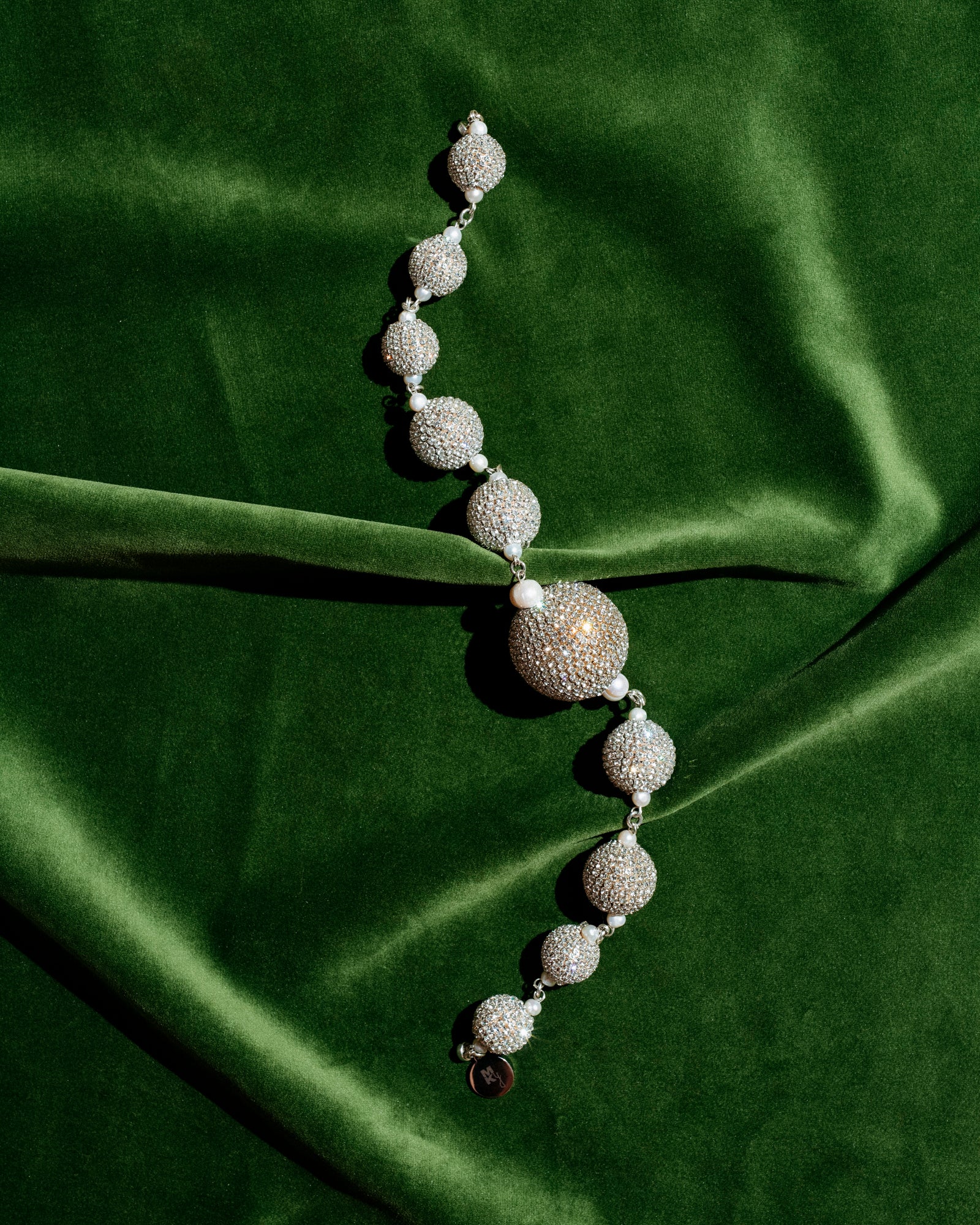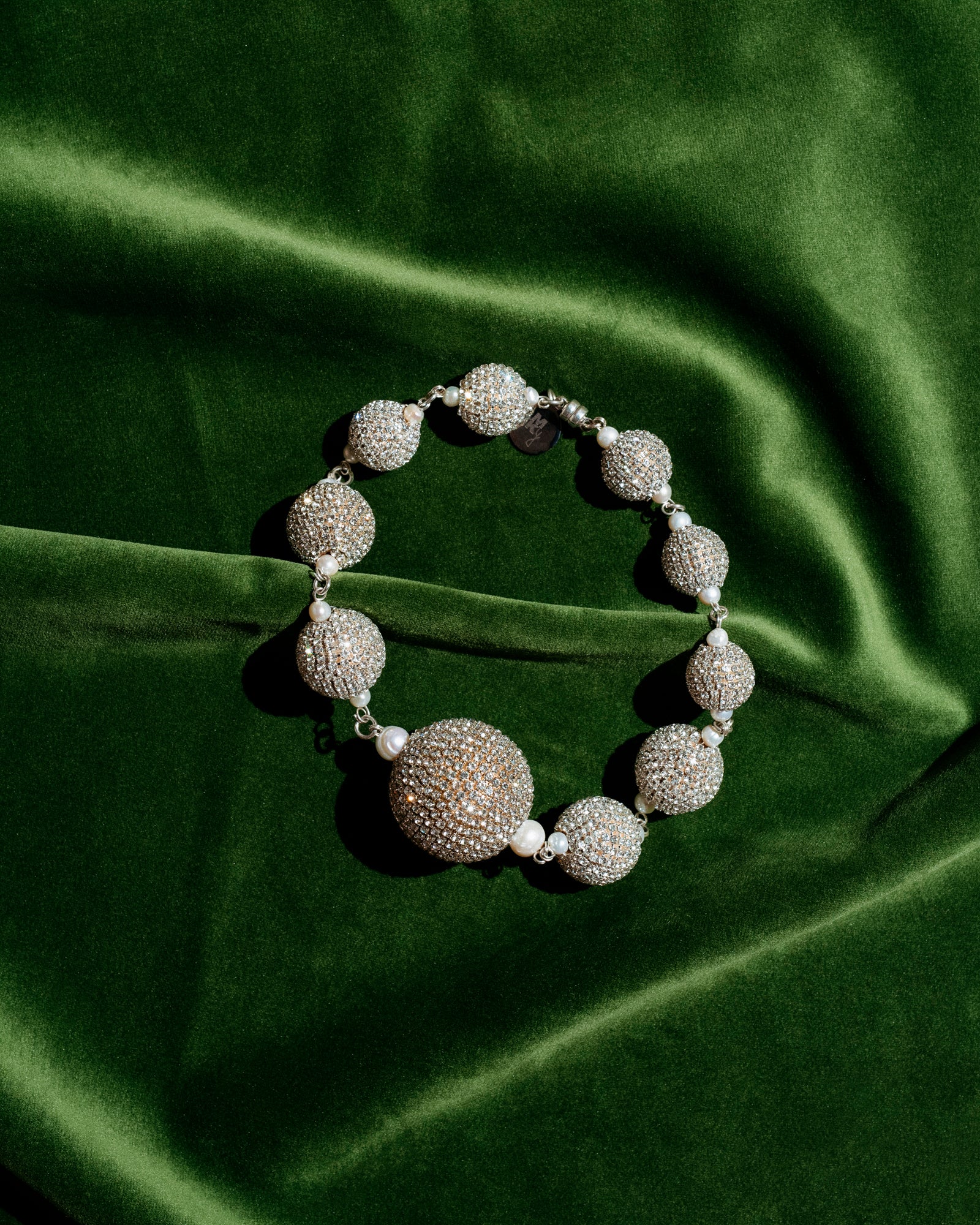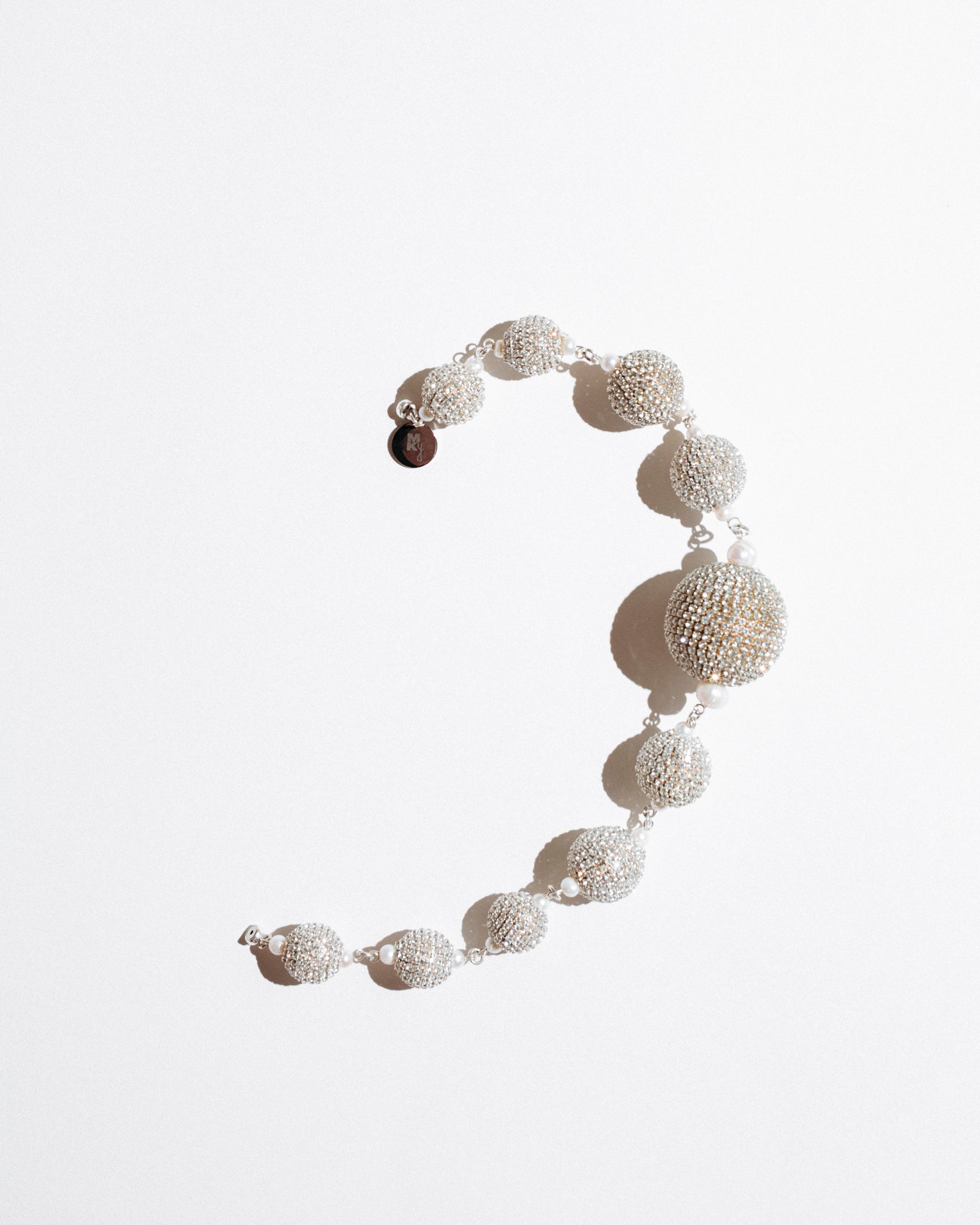 Make a statement with the Snow Glam necklace, a dazzling combination of elegance and bold design. Featuring handcrafted crystal-encrusted spheres, luminous pearls, and premium silver fittings, this necklace exudes sophistication. Perfect for festive occasions, evening events, or adding a touch of glamour to your everyday look, the Snow Glam necklace is a timeless piece that will elevate any outfit.