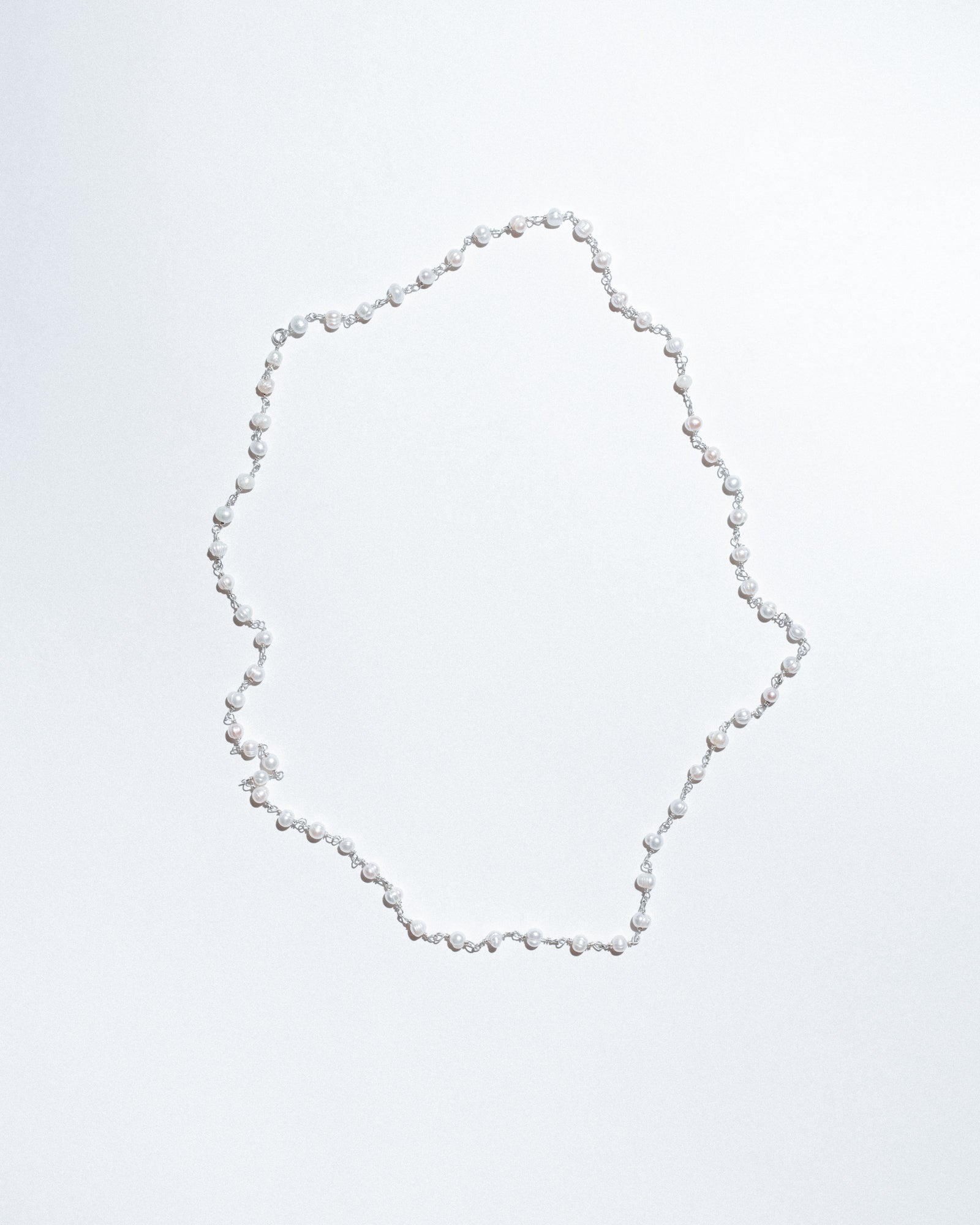 A necklace crafted using a new technique for our brand. The pearls are connected with silver rings. It looks luxurious.
