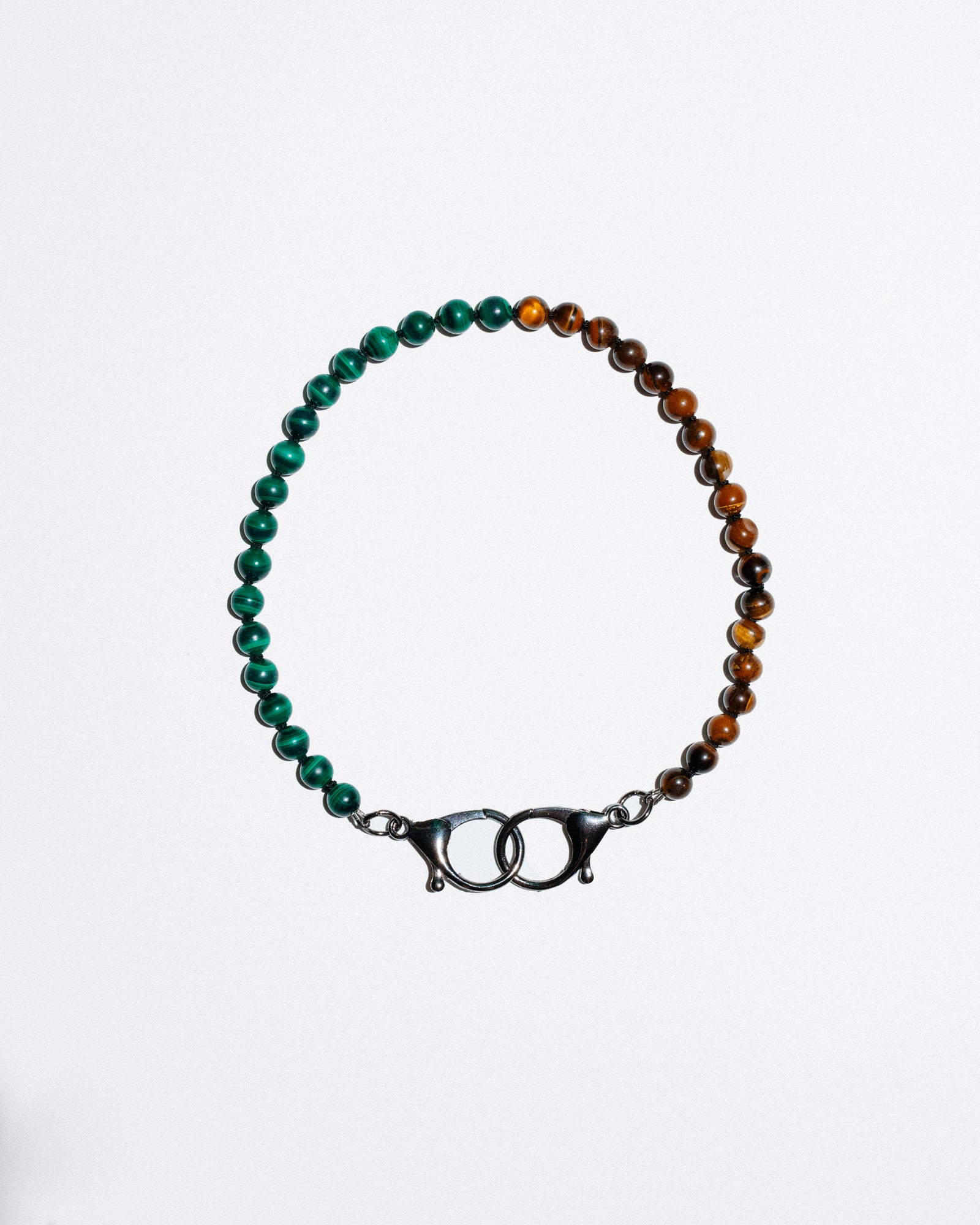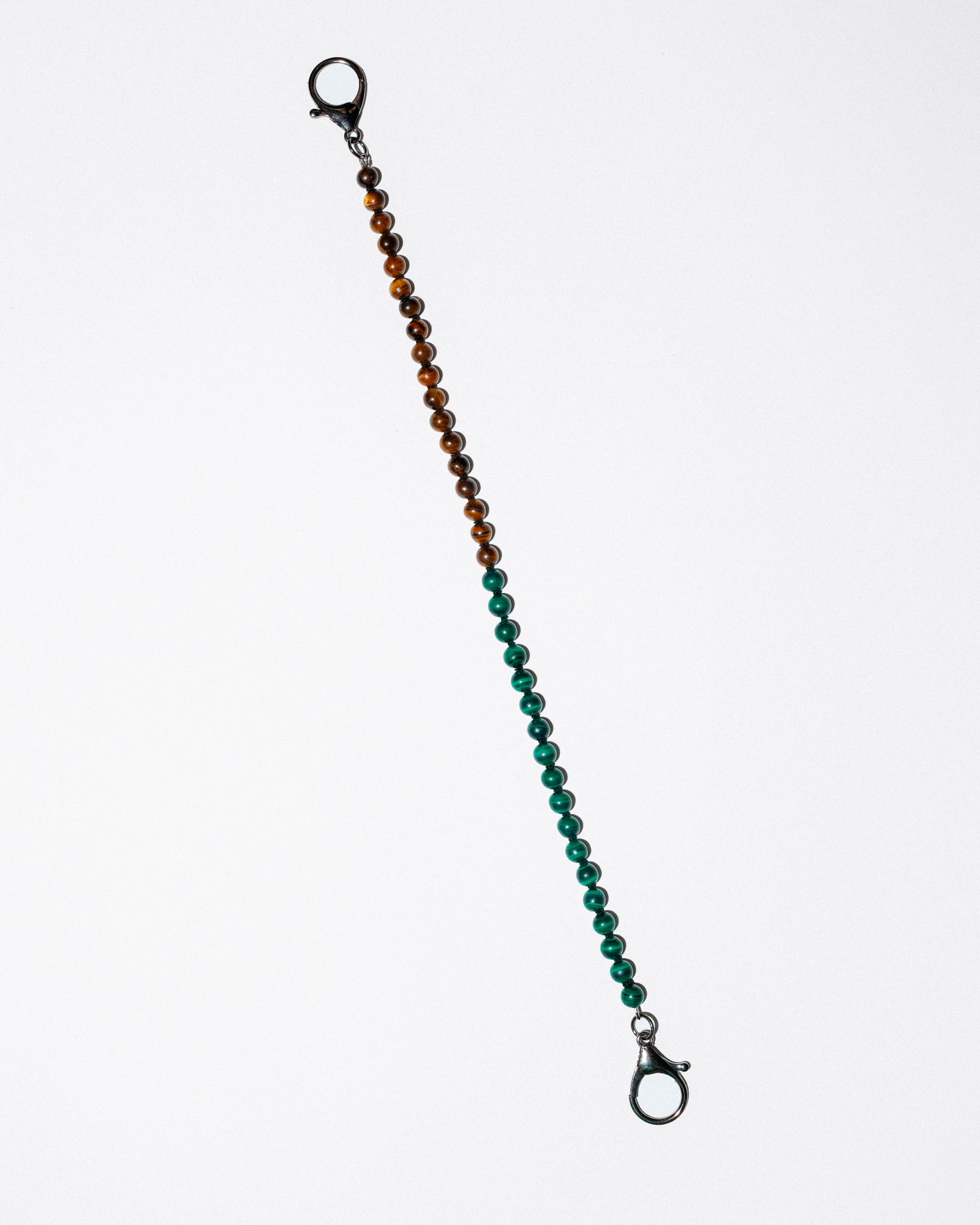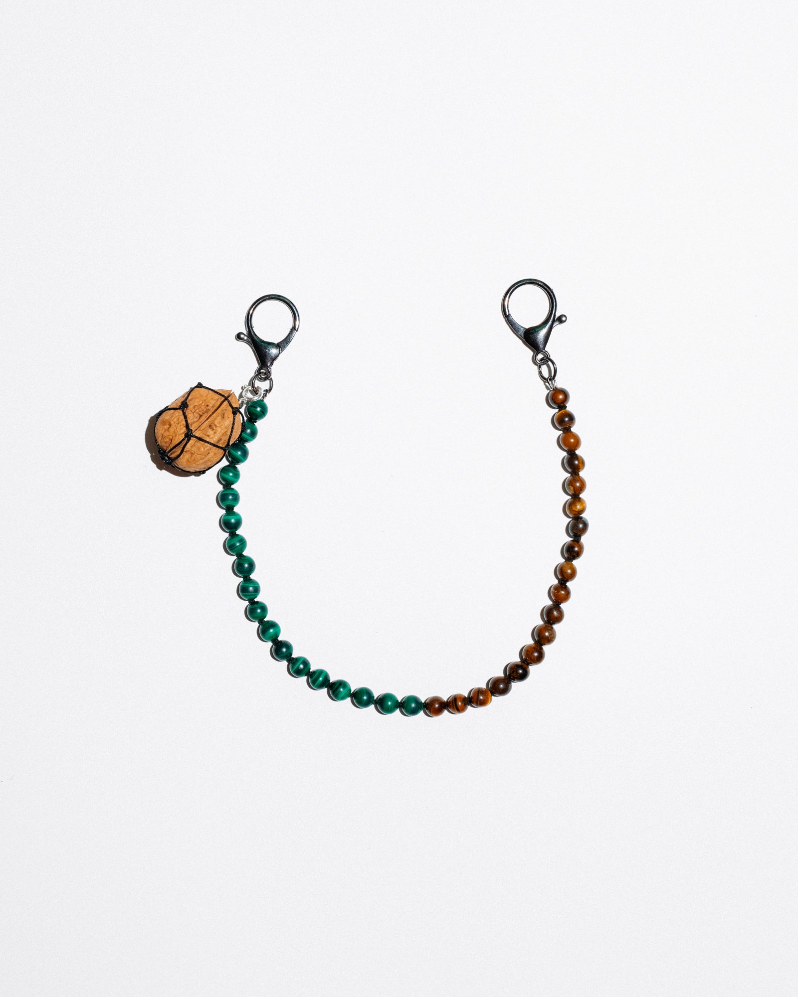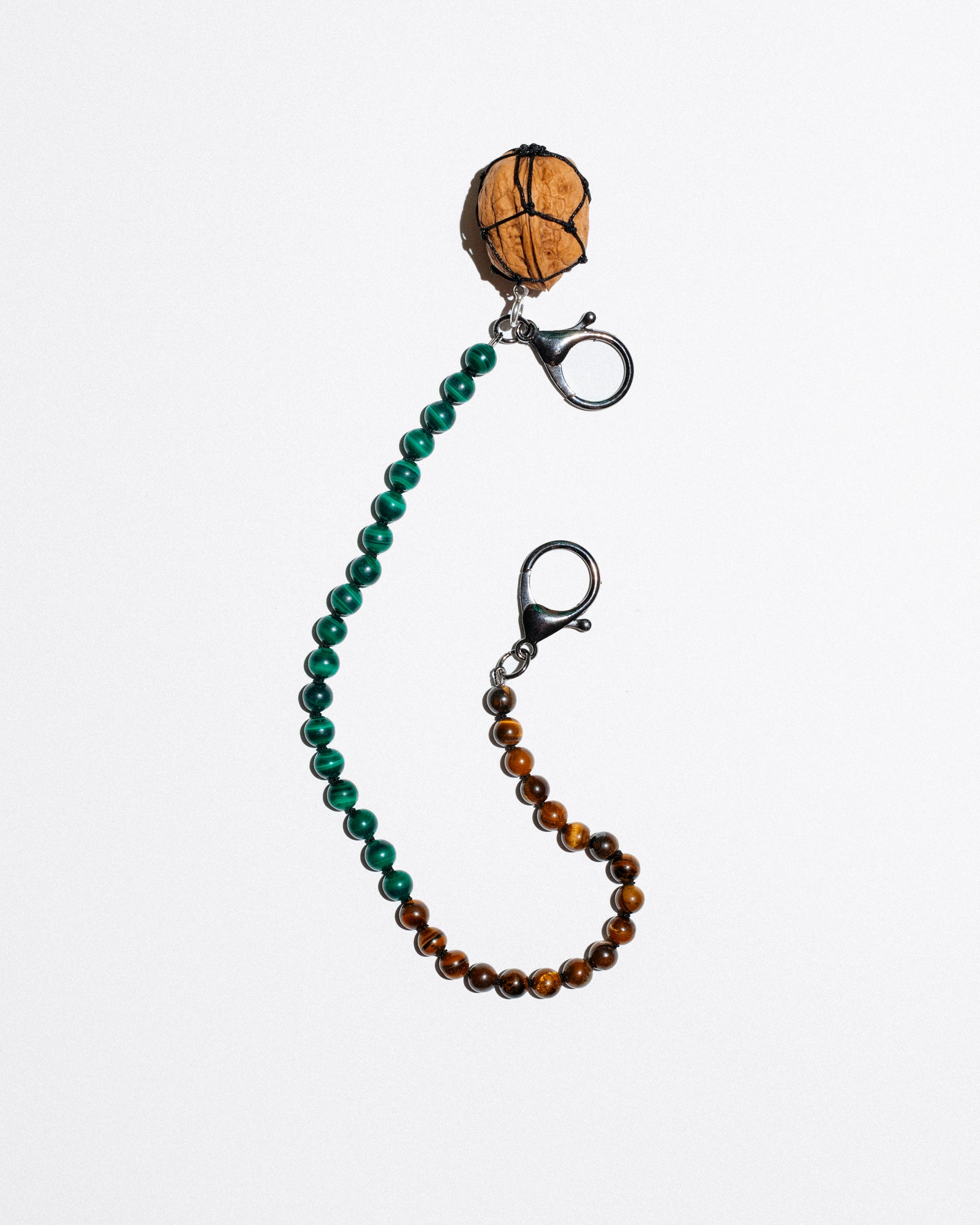 The Tiger & Leaf Key-Ring blends natural elegance with everyday function. Crafted with Tiger’s Eye and Malachite beads, it symbolizes strength and renewal. The detachable Walnut charm adds a rustic touch, while the sturdy steel clasps ensure durability. Perfect for keys or as a stylish accessory for bags.